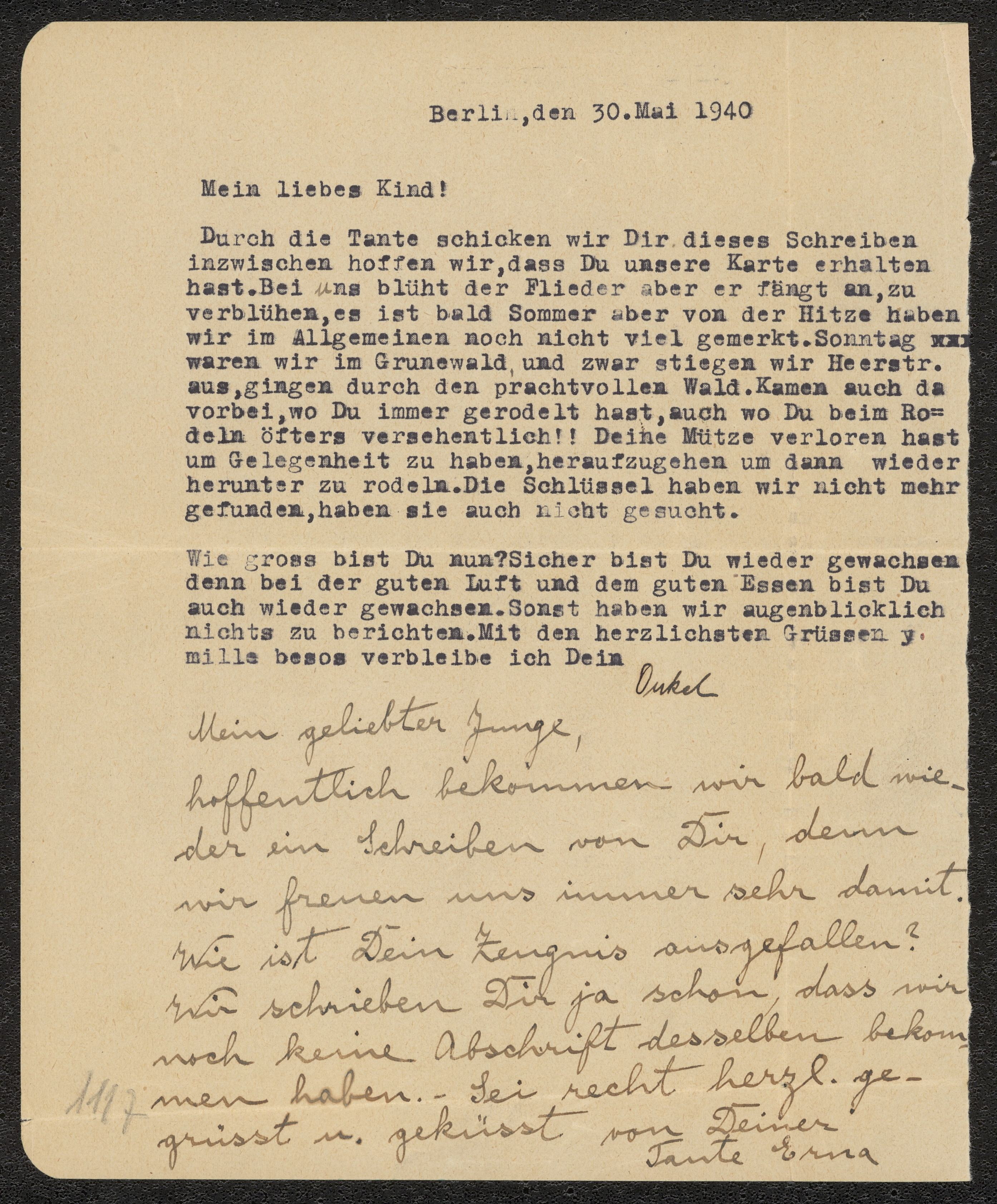 Brev från Onkel Carl och Tante Erna till Ludwig Posner daterat 30 maj 1940.