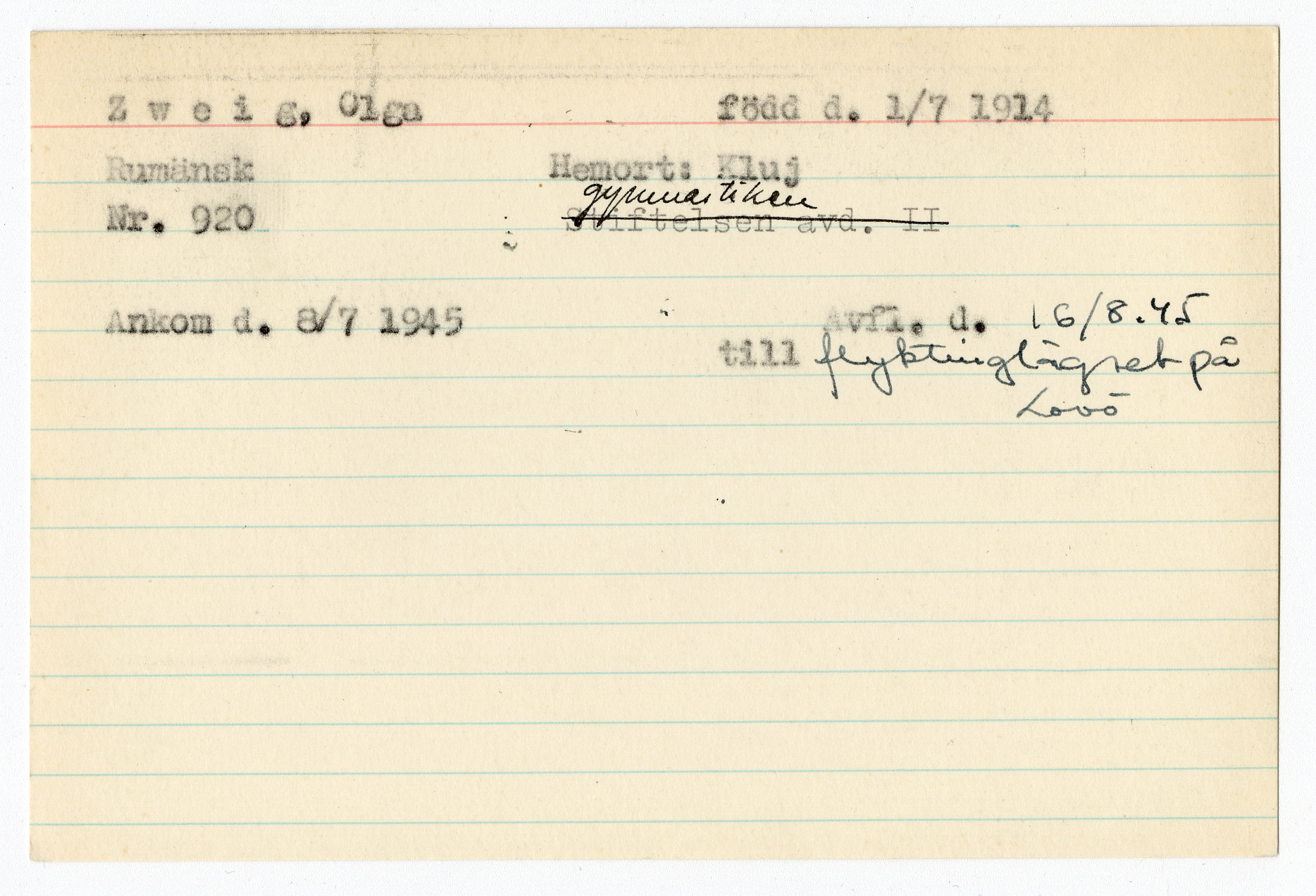Ett skrivkort med patientuppgifter gällande Olga Zweig.