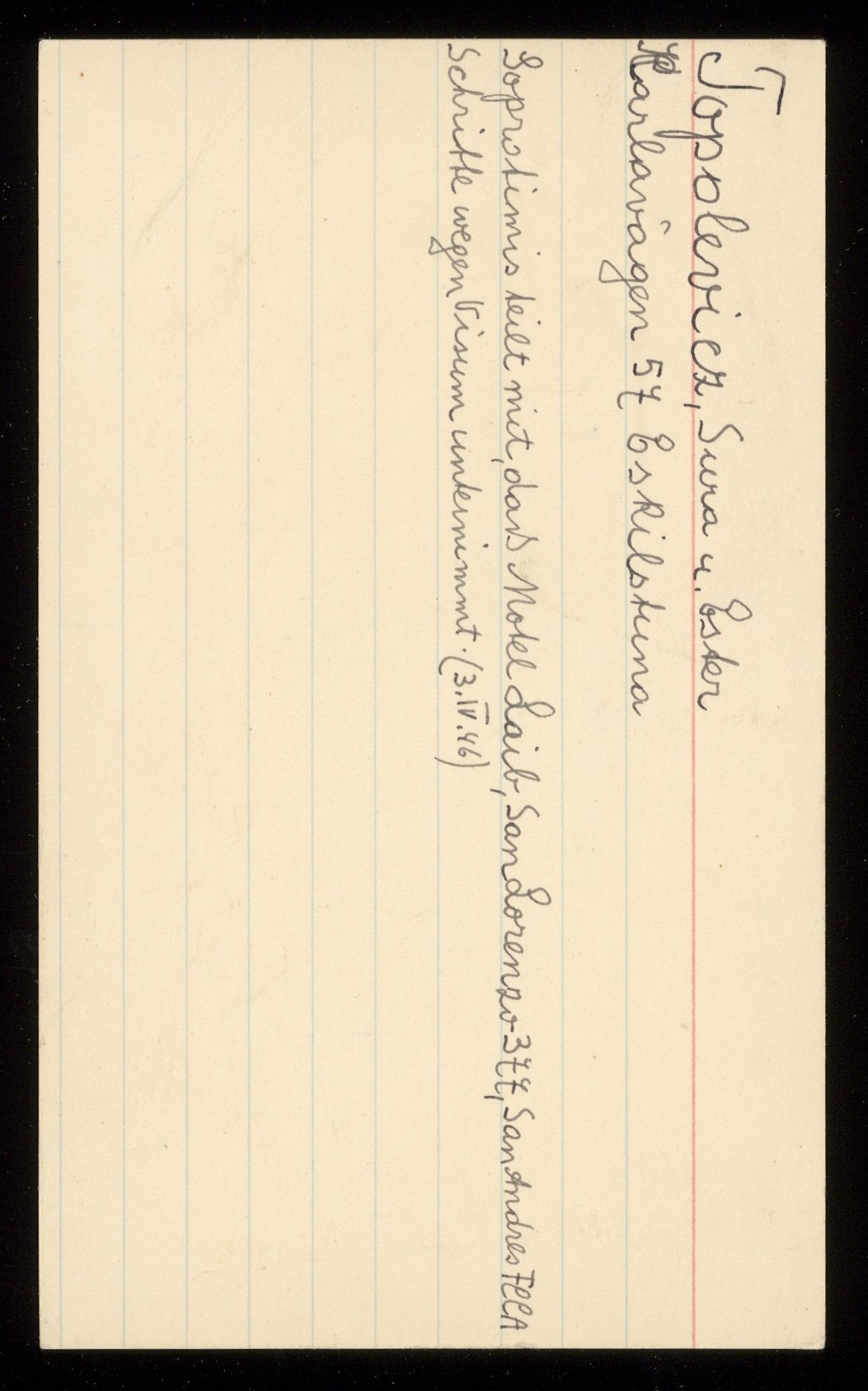 Ett skrivkort med patientuppgifter gällande Seera Topolevicz.
