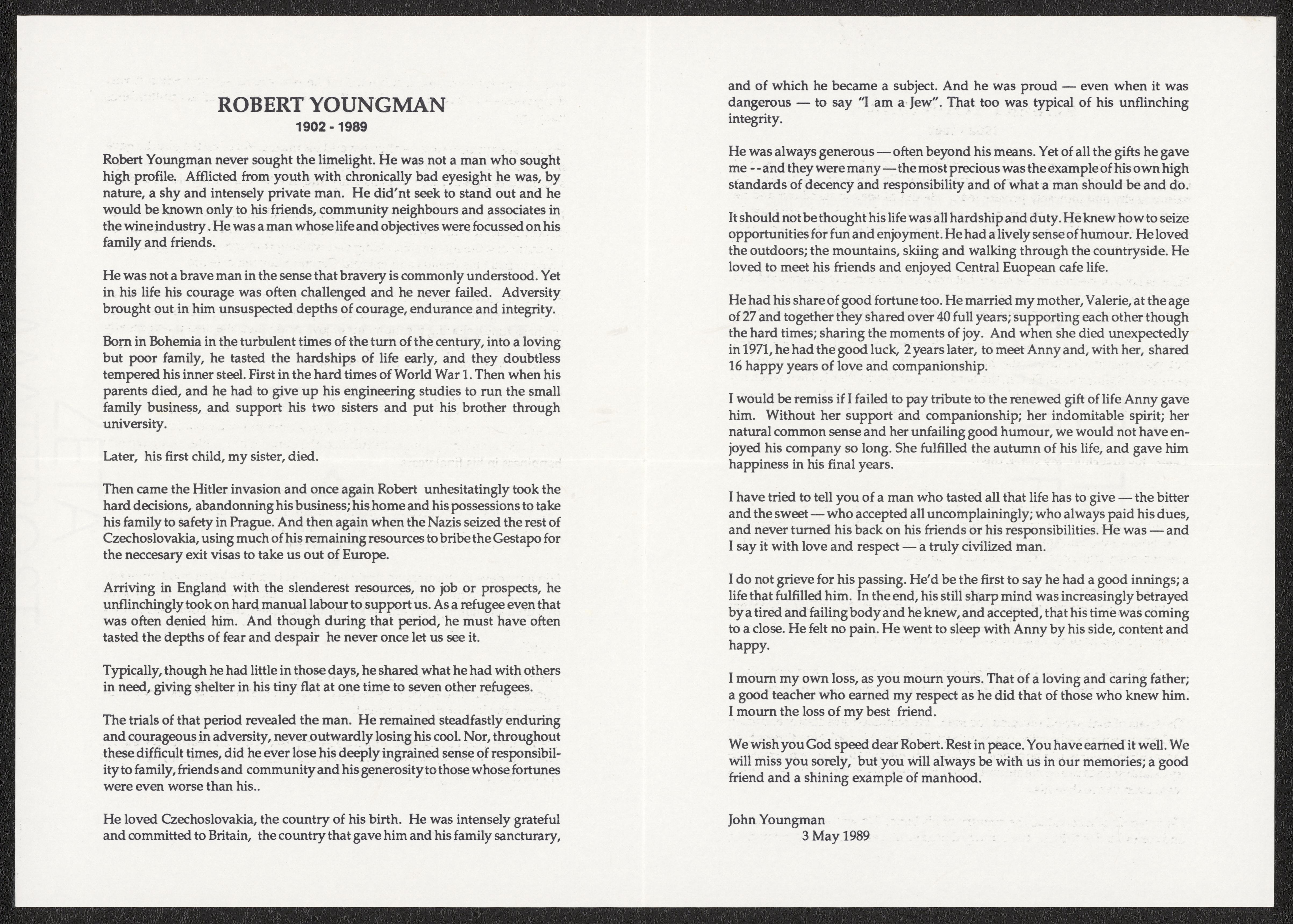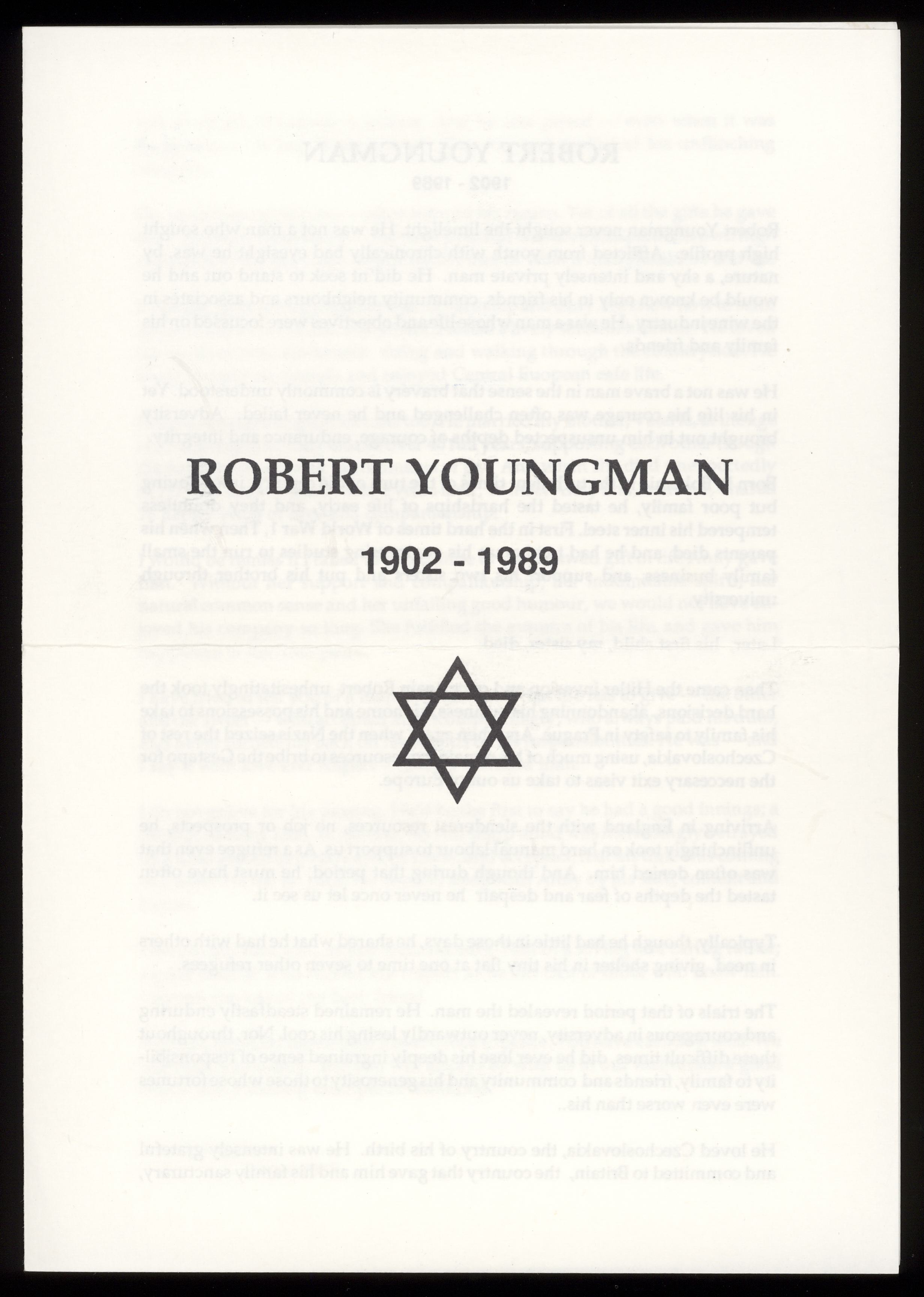 Brev till Otto Ullman från Anny Youngman angående kusin Robert Youngmans bortgång, samt en text om Robert Youngmans liv, skriven av Roberts son John Youngman 11 maj 1989 London.