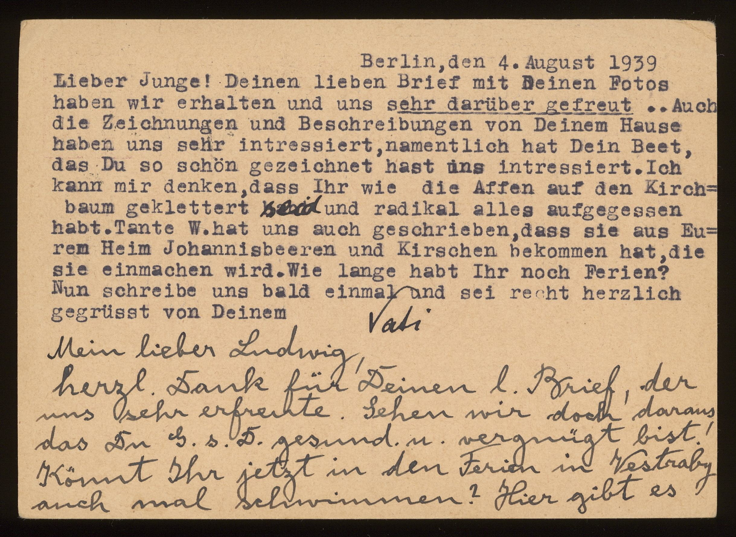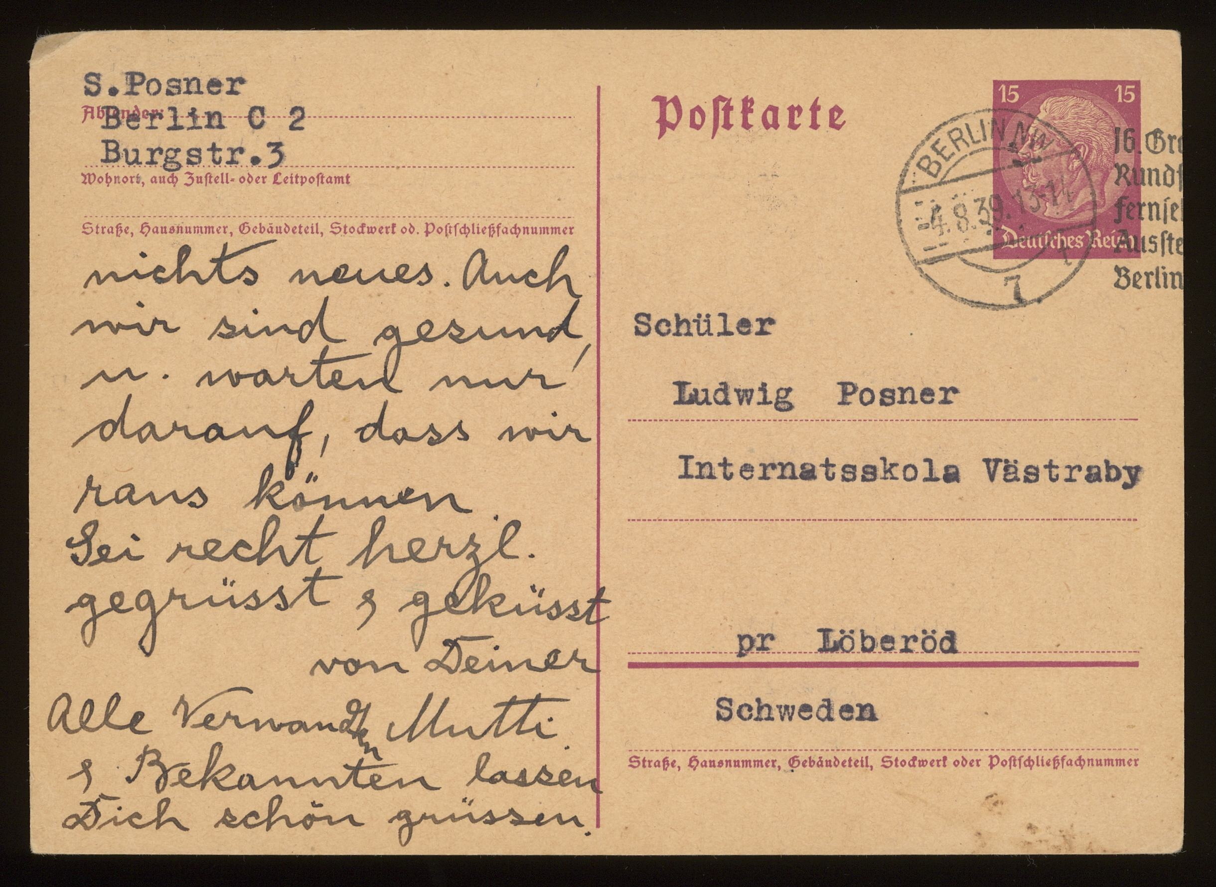 Brevkort från föräldrarna Anna och Siegfried Posner till sonen Ludwig Posner daterat 4 augusti 1939.
