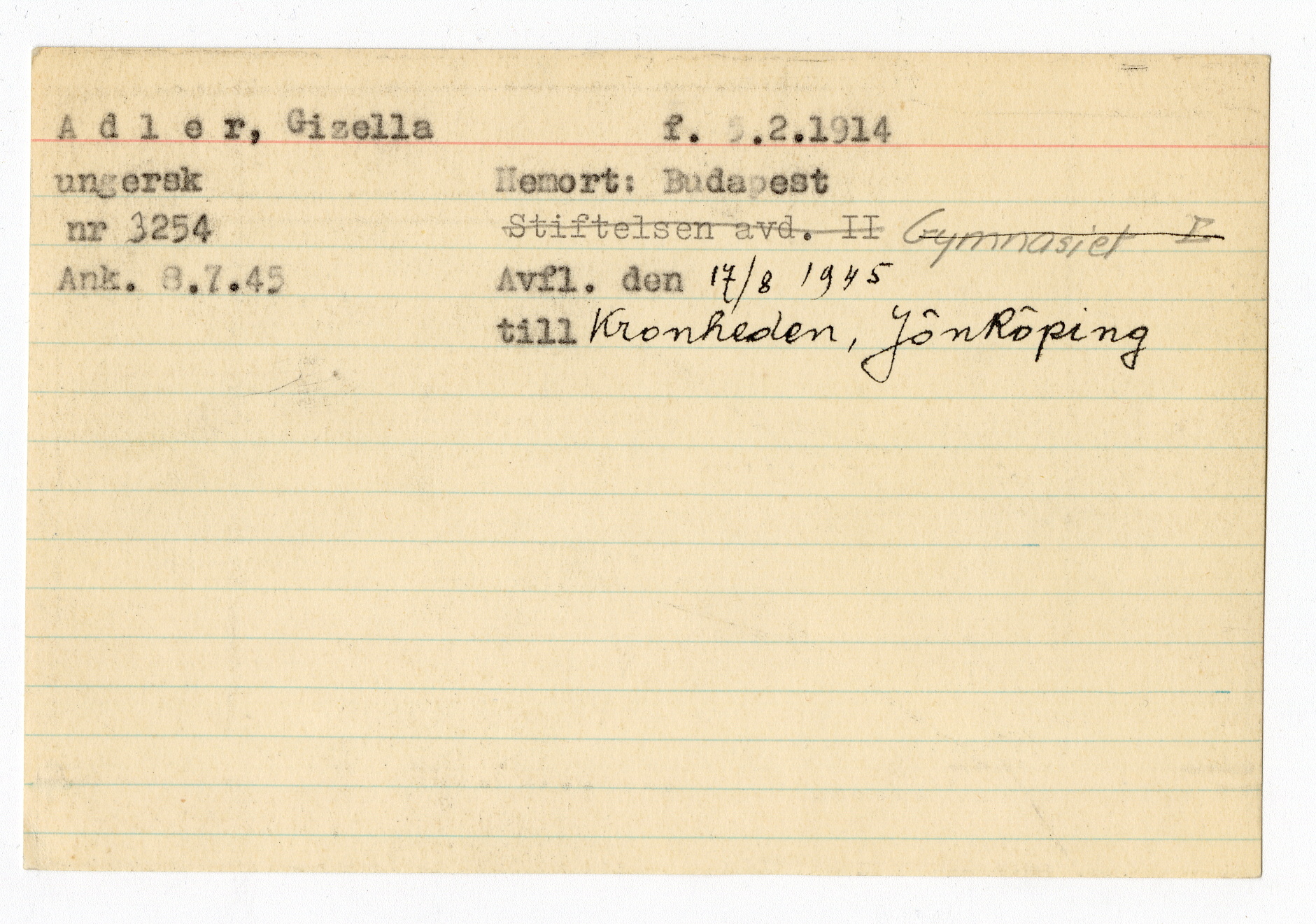 Registerkort Gizella Adler