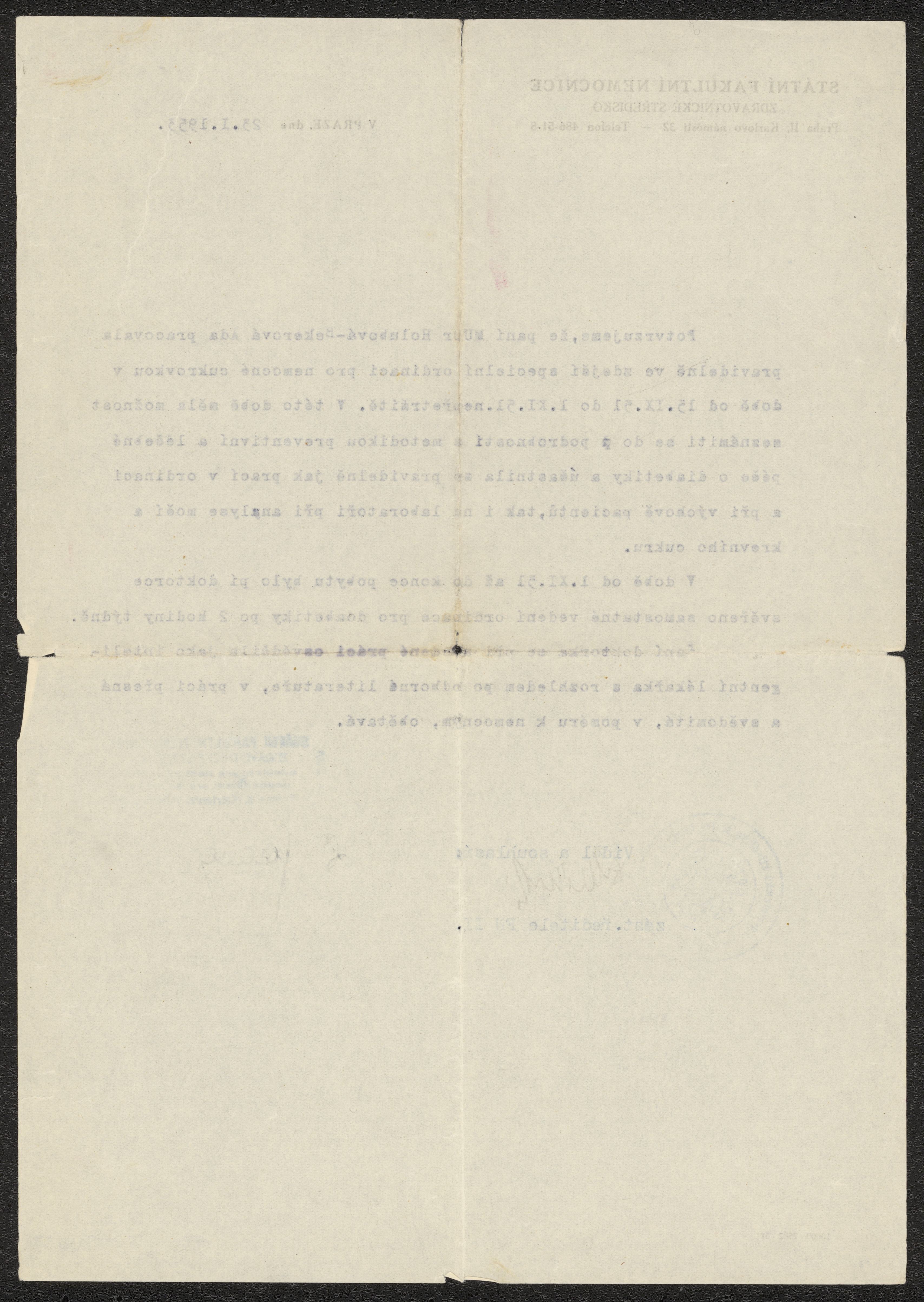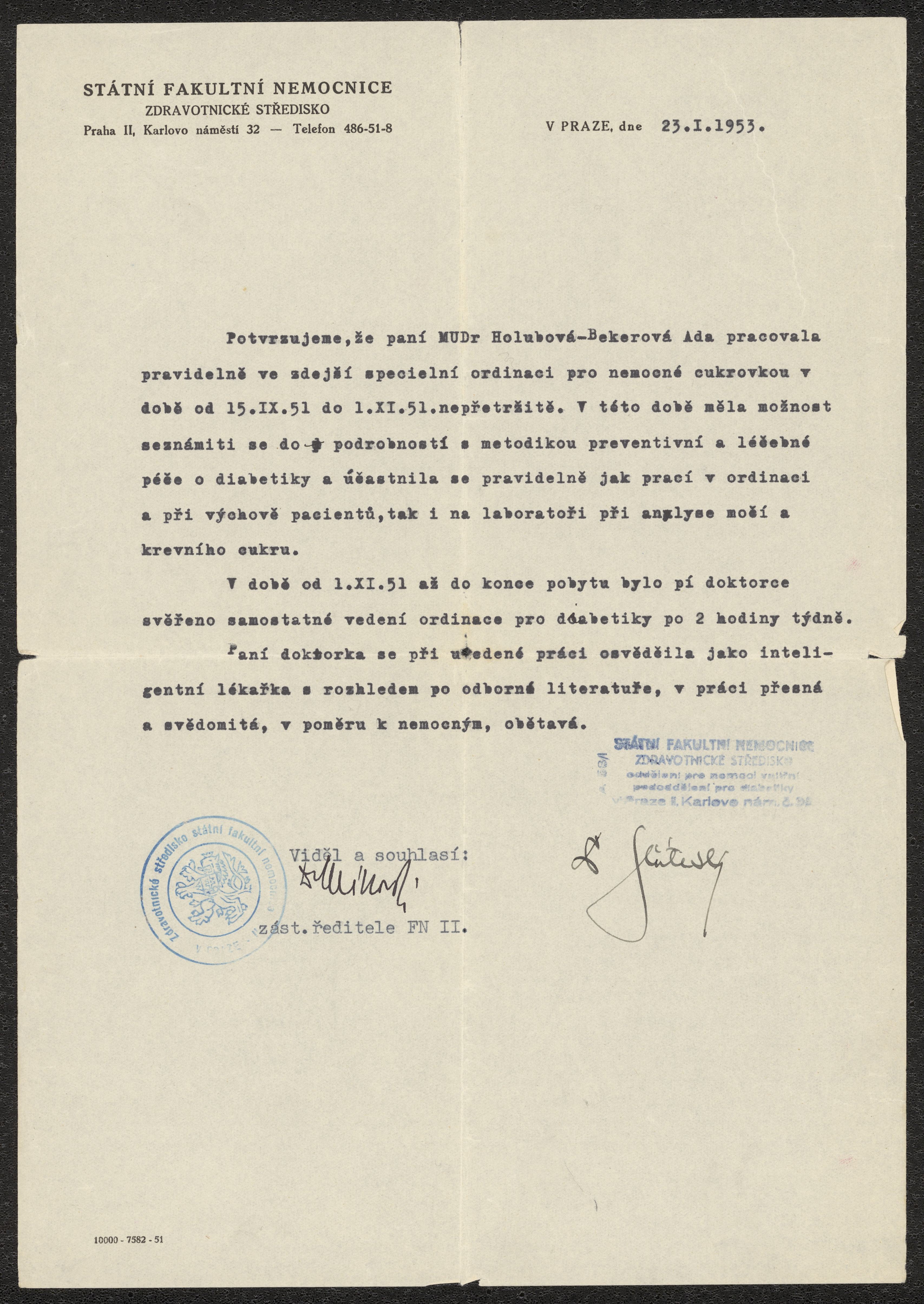 Arbetsintyg för Ada Becker, för anställning vid hälsovårdscentralen i Prag (Statens fakultetssjukhus), för tiden 15 september 1951 t.o.m. 1 november 1952.