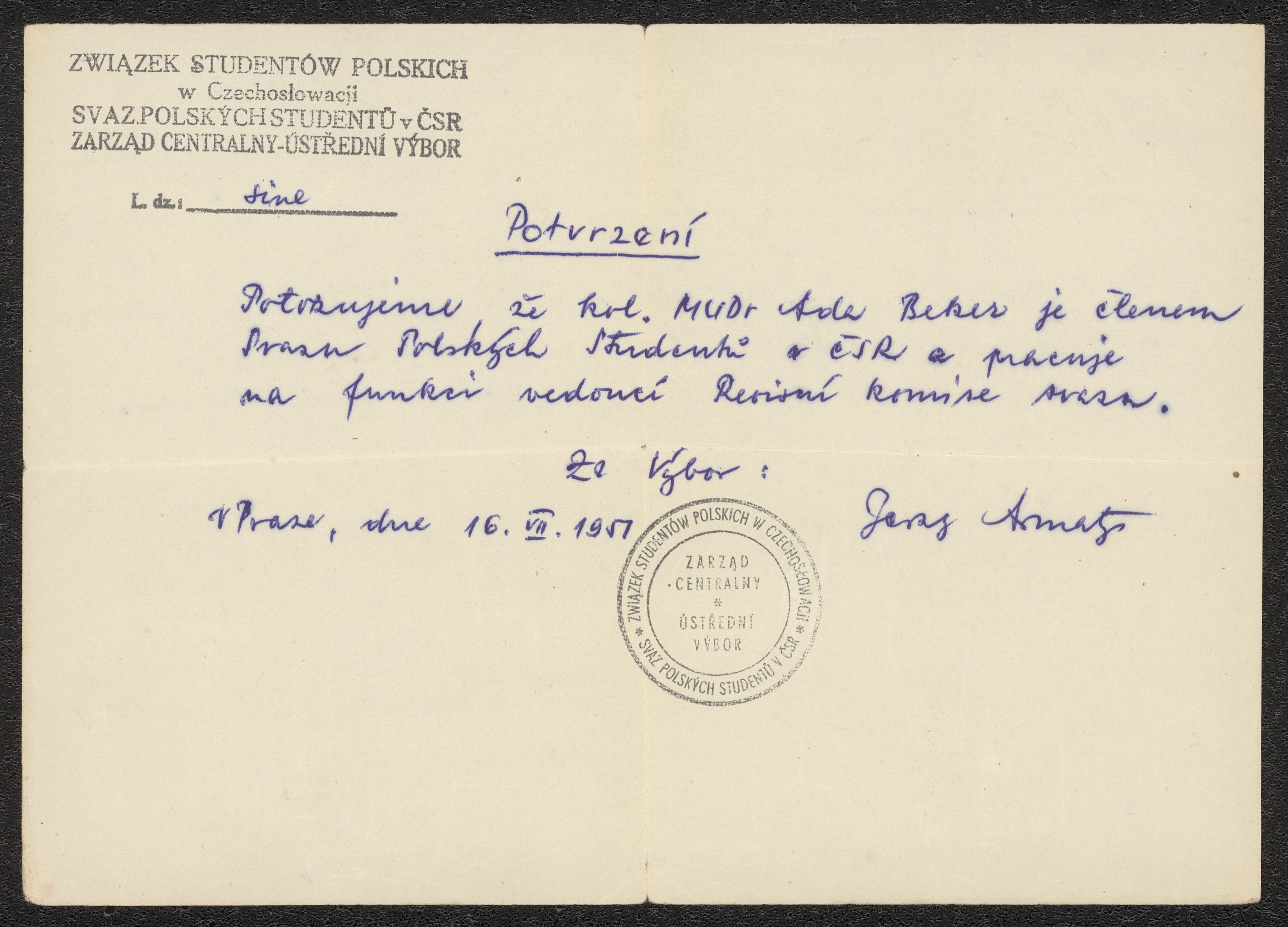 Handskrivet intyg om medlemskap i polska studentorganisationen, för Ada Becker.