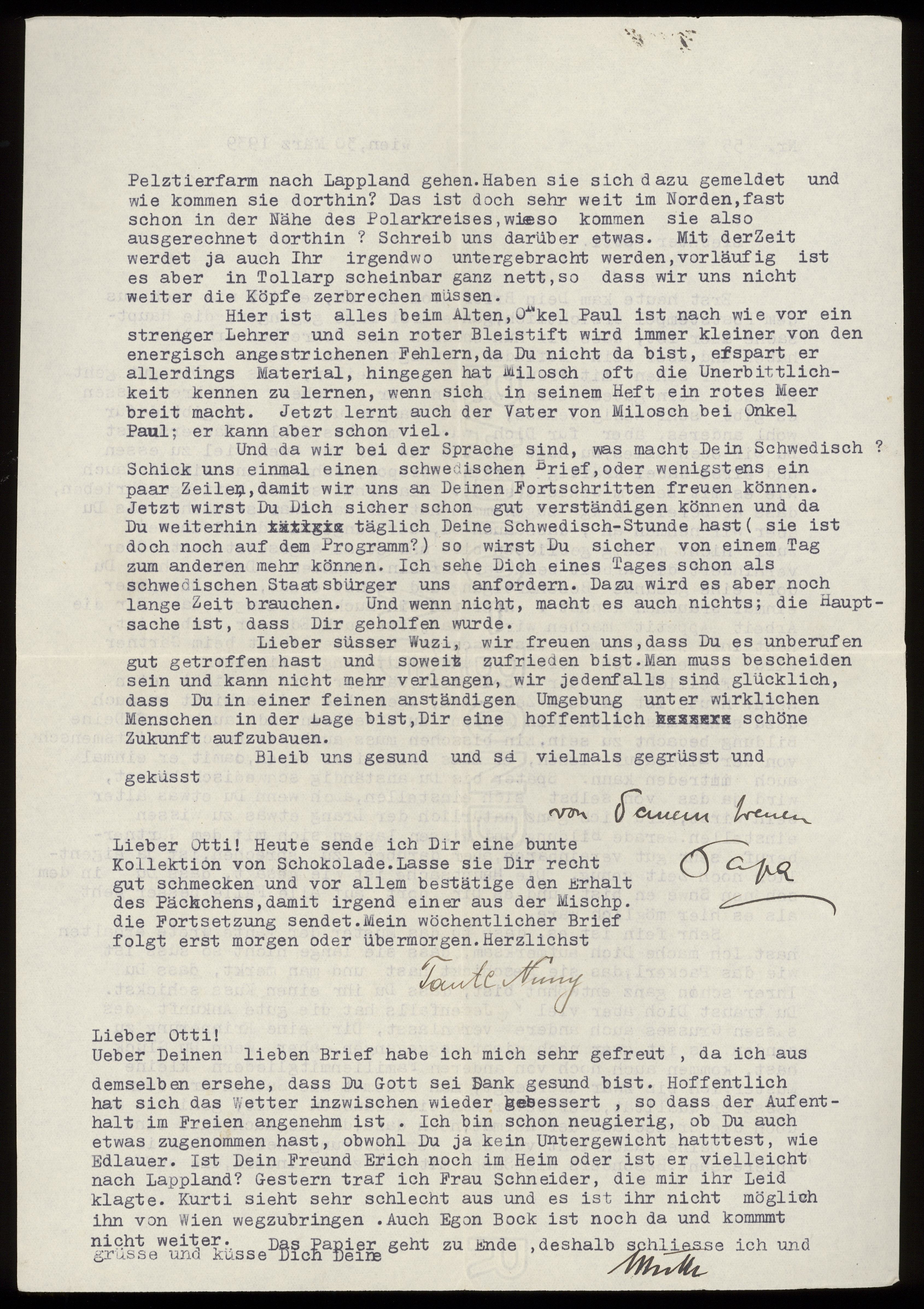 Maskinskrivet brev till Otto Ullman från föräldrarna Josef och Elise Ullmann och moster Minna "Nuny" Kollmann daterat 30 mars 1939 Wien.