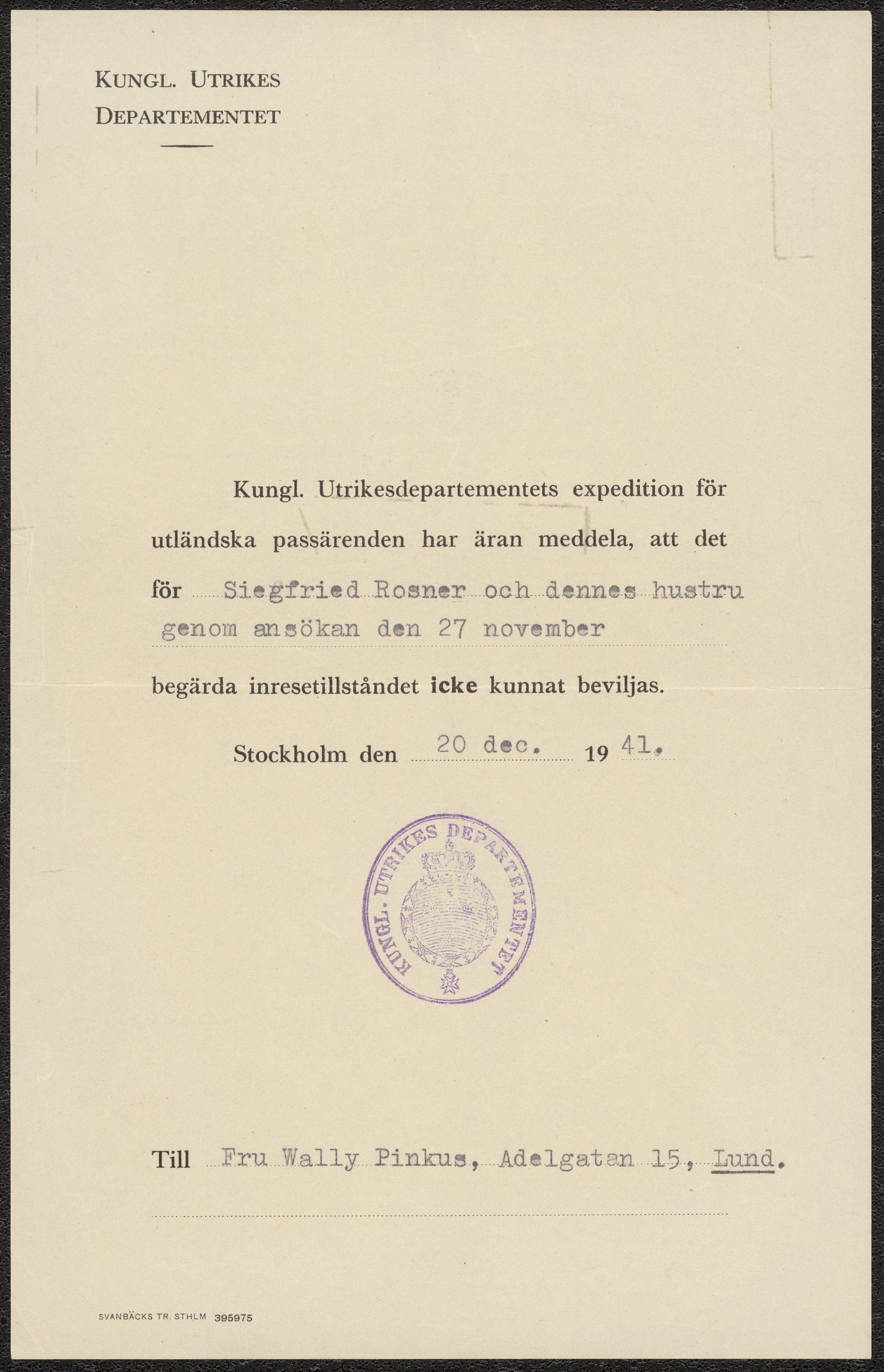 Avslag på inreseansökan utfärdat av Svenska utrikesdepartementet. 1 sida.