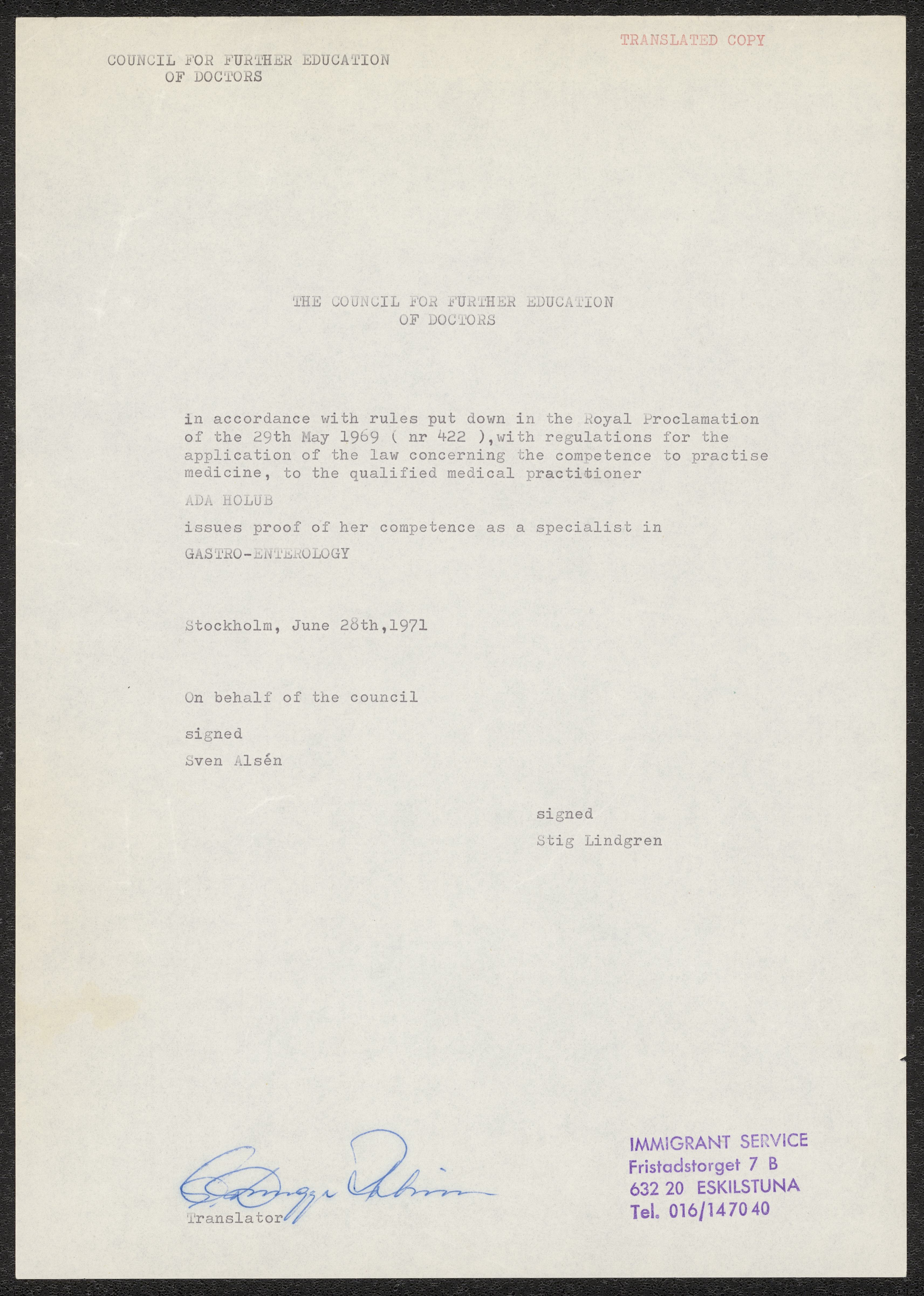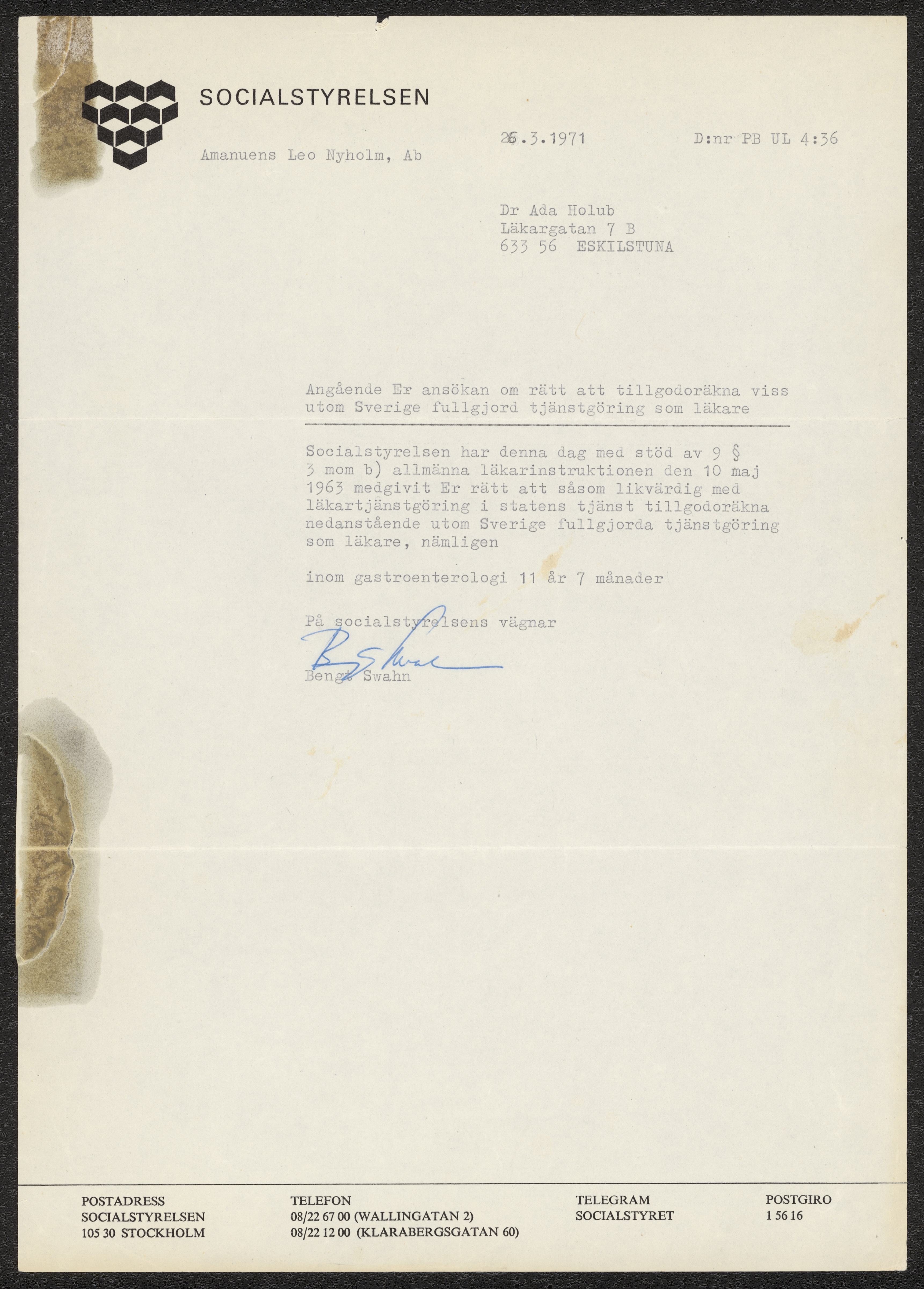 Godkännande att tillgodoräkna viss utom Sverige fullgjord tjänstgöring som läkare, från Socialstyrlesen till Ada holub 1971, samt översatt kopia till engelska.