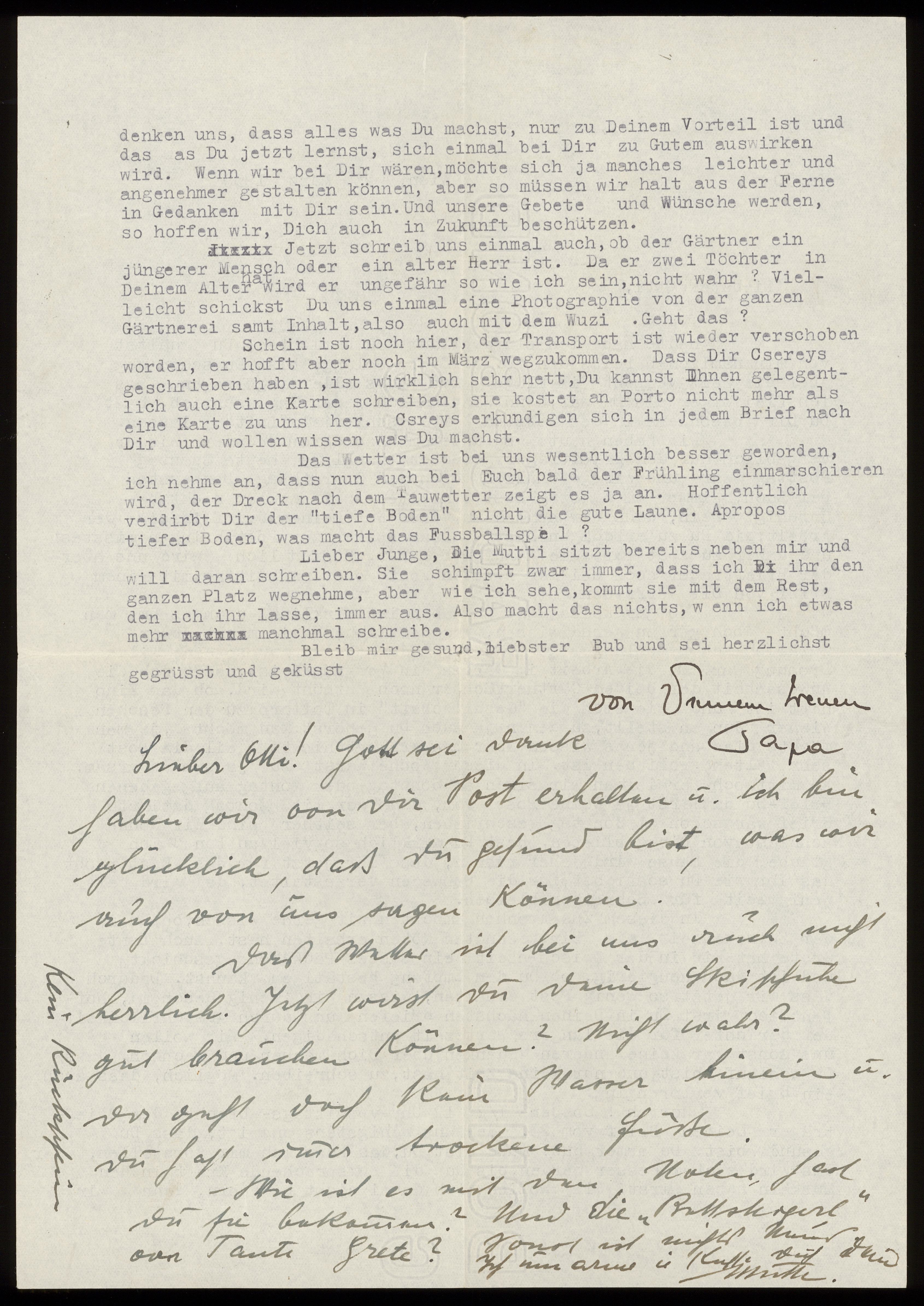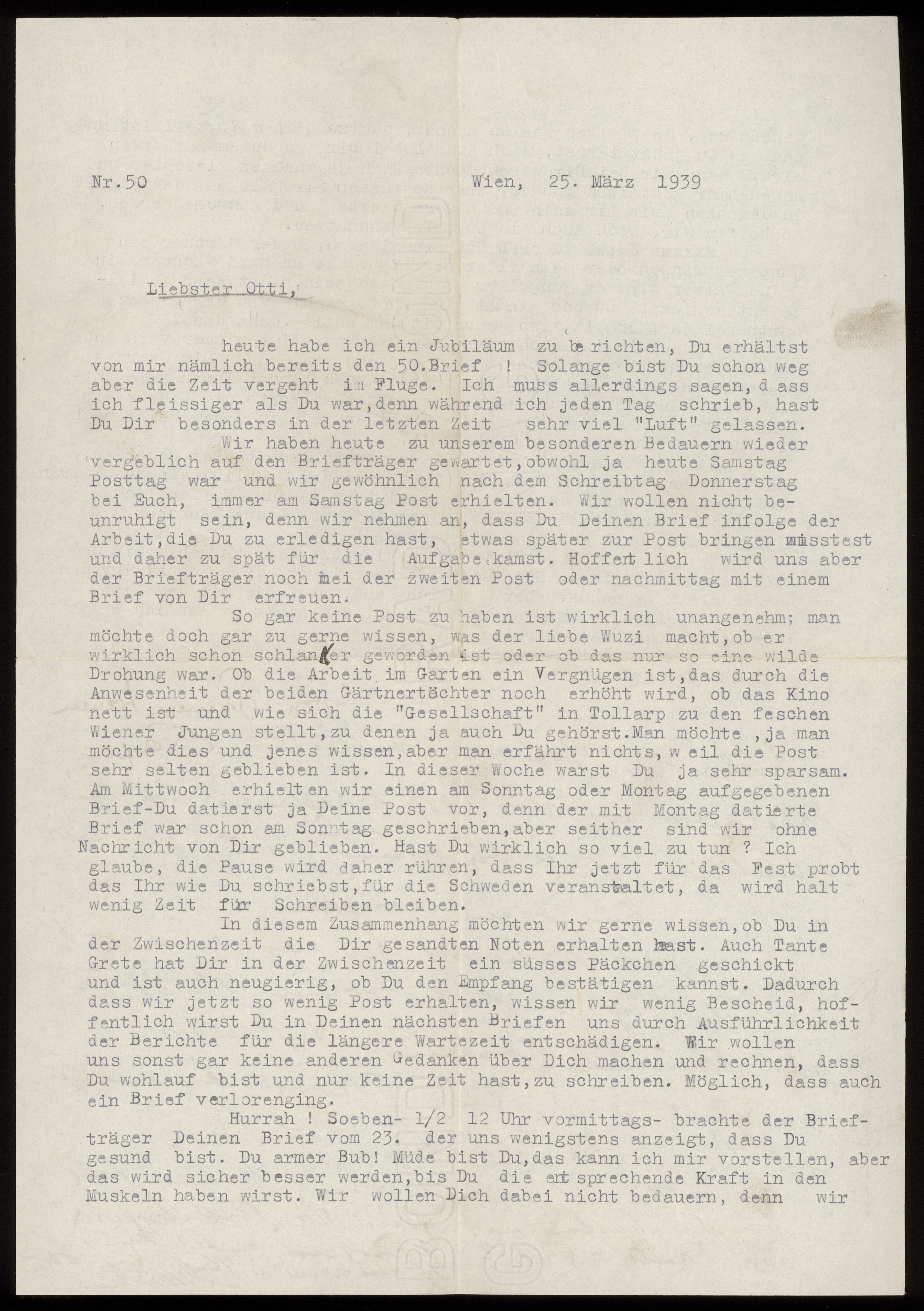 Maskinskrivet brev till Otto Ullman från föräldrarna Josef och Elise Ullmann daterat 25 mars 1939 Wien.