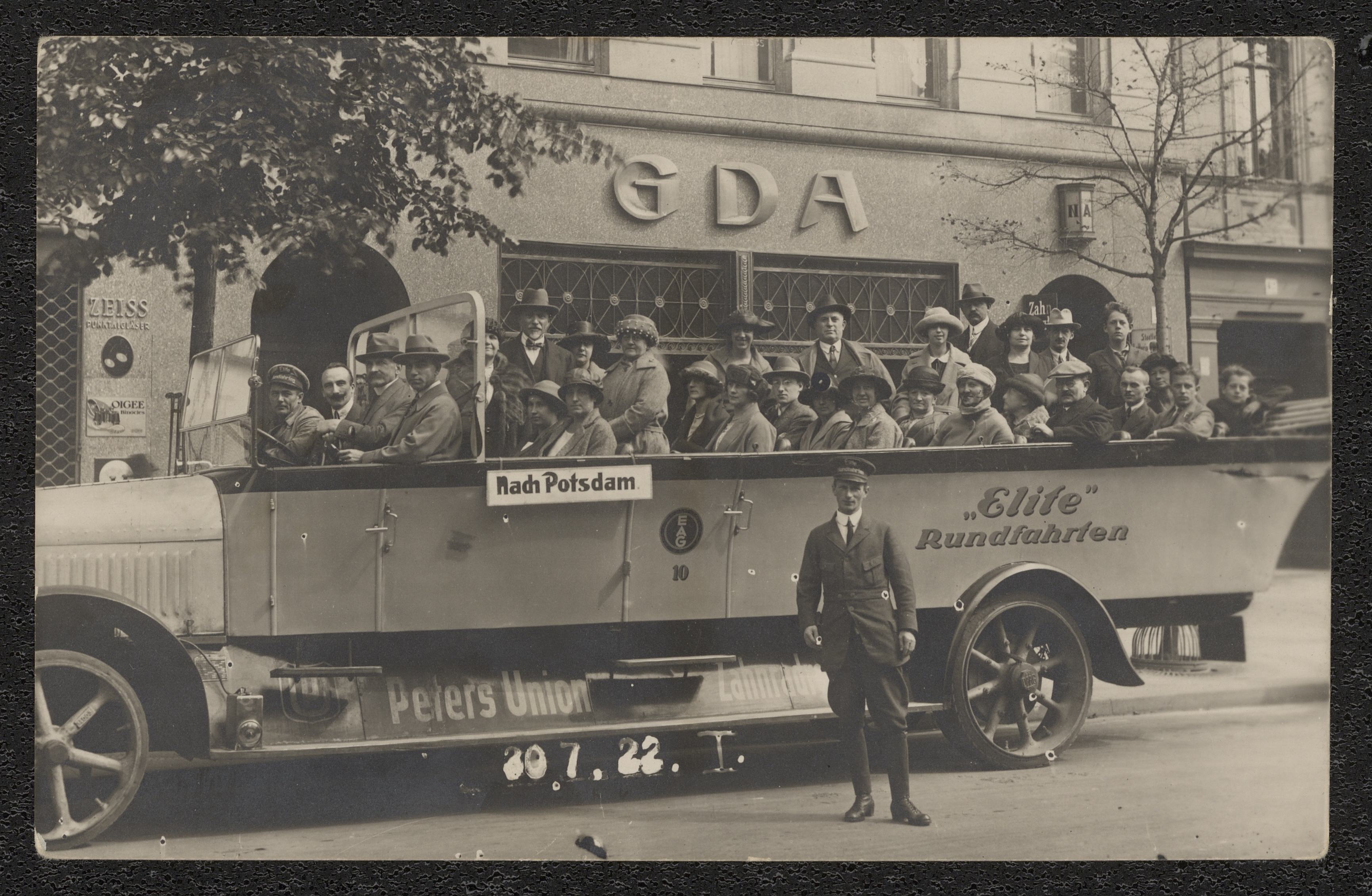 Svart vitt gruppfotografi från Berlin på personer som sitter i en öppen buss. Framför bussen står en man iförd arbetsuniform. På bussen står texter "Elite" Rundfahren. Nach Potsdam. Peters Union? Lahn? I bagrunden syns en butiksskylt med bokstäverna GDA.