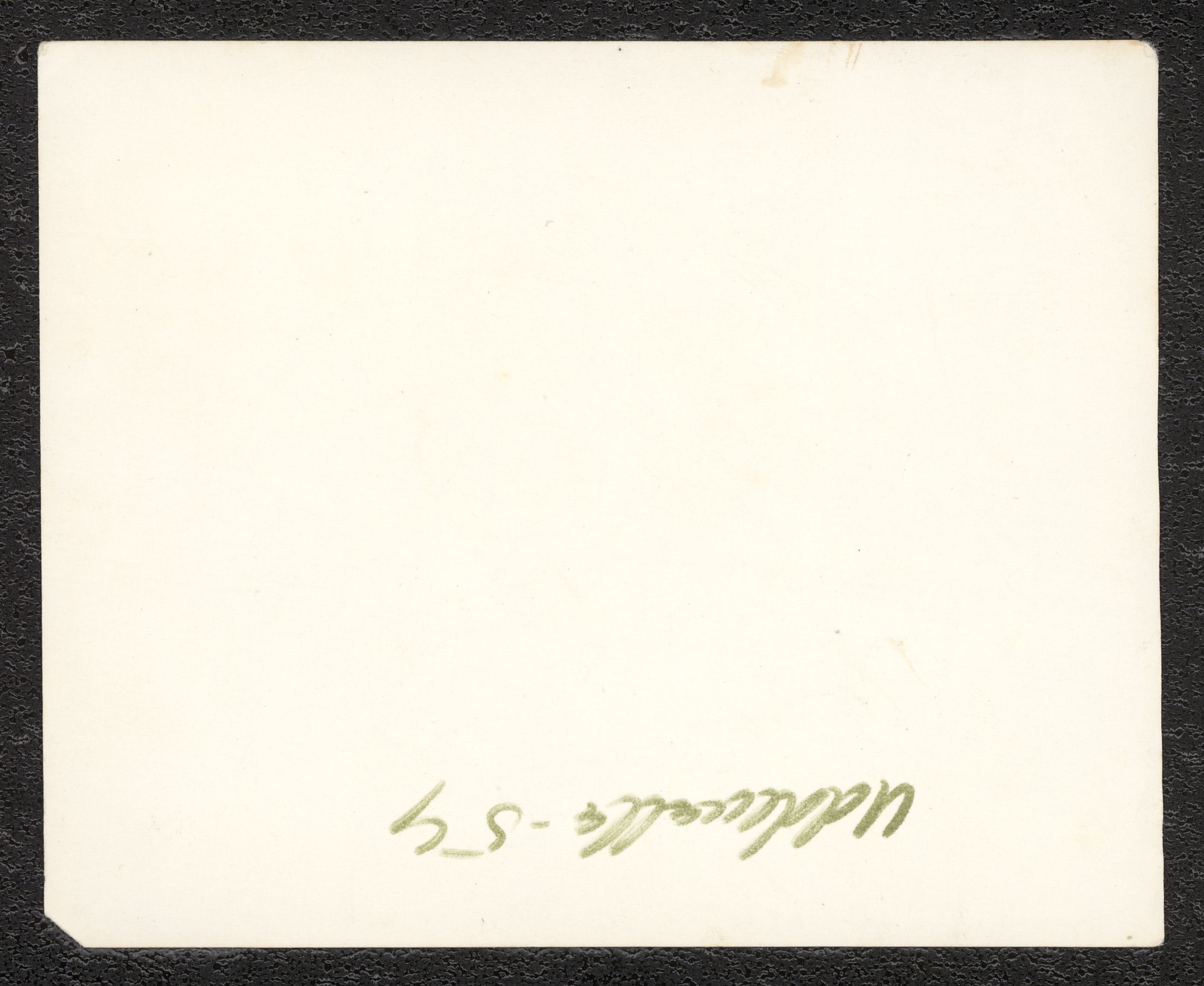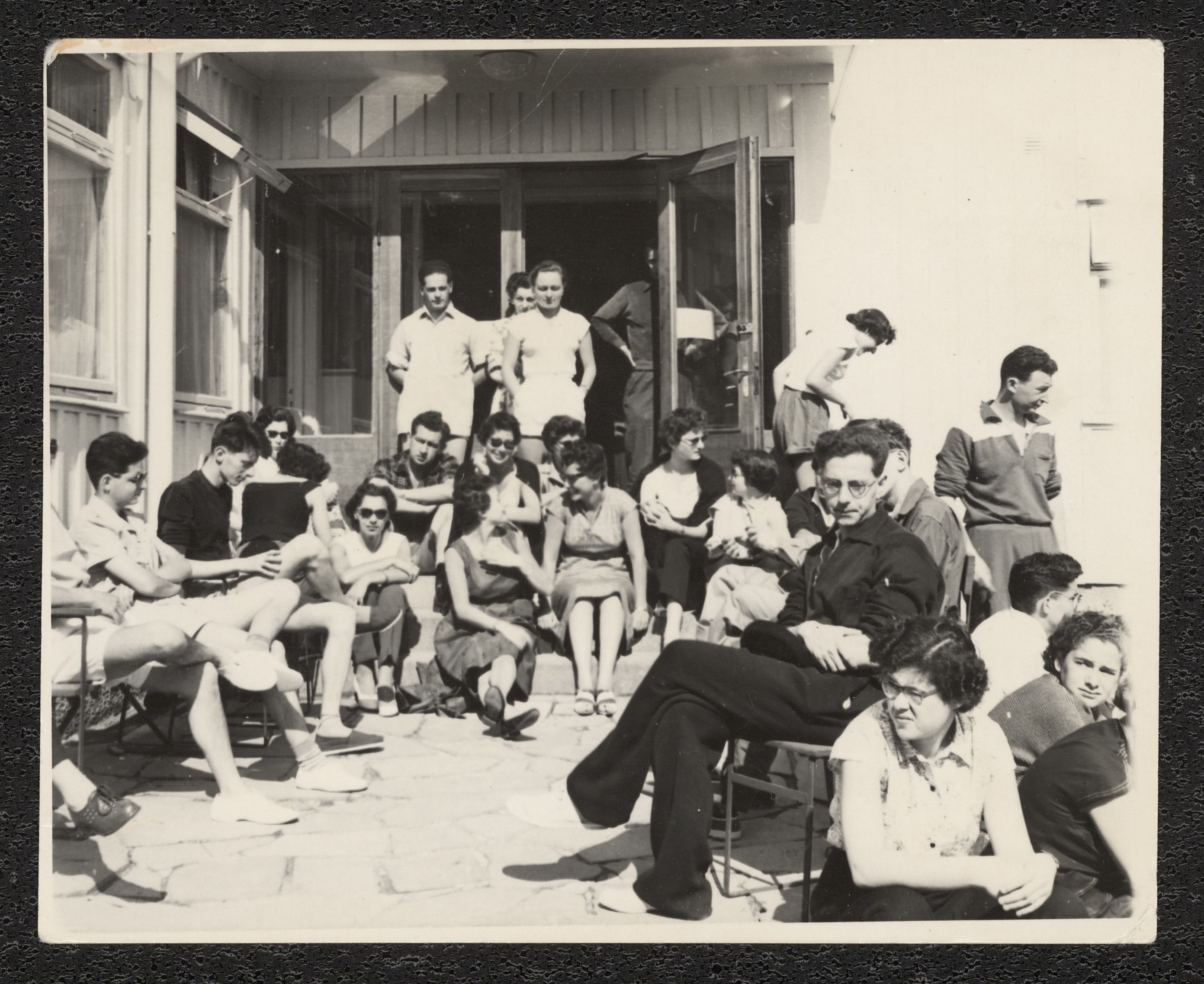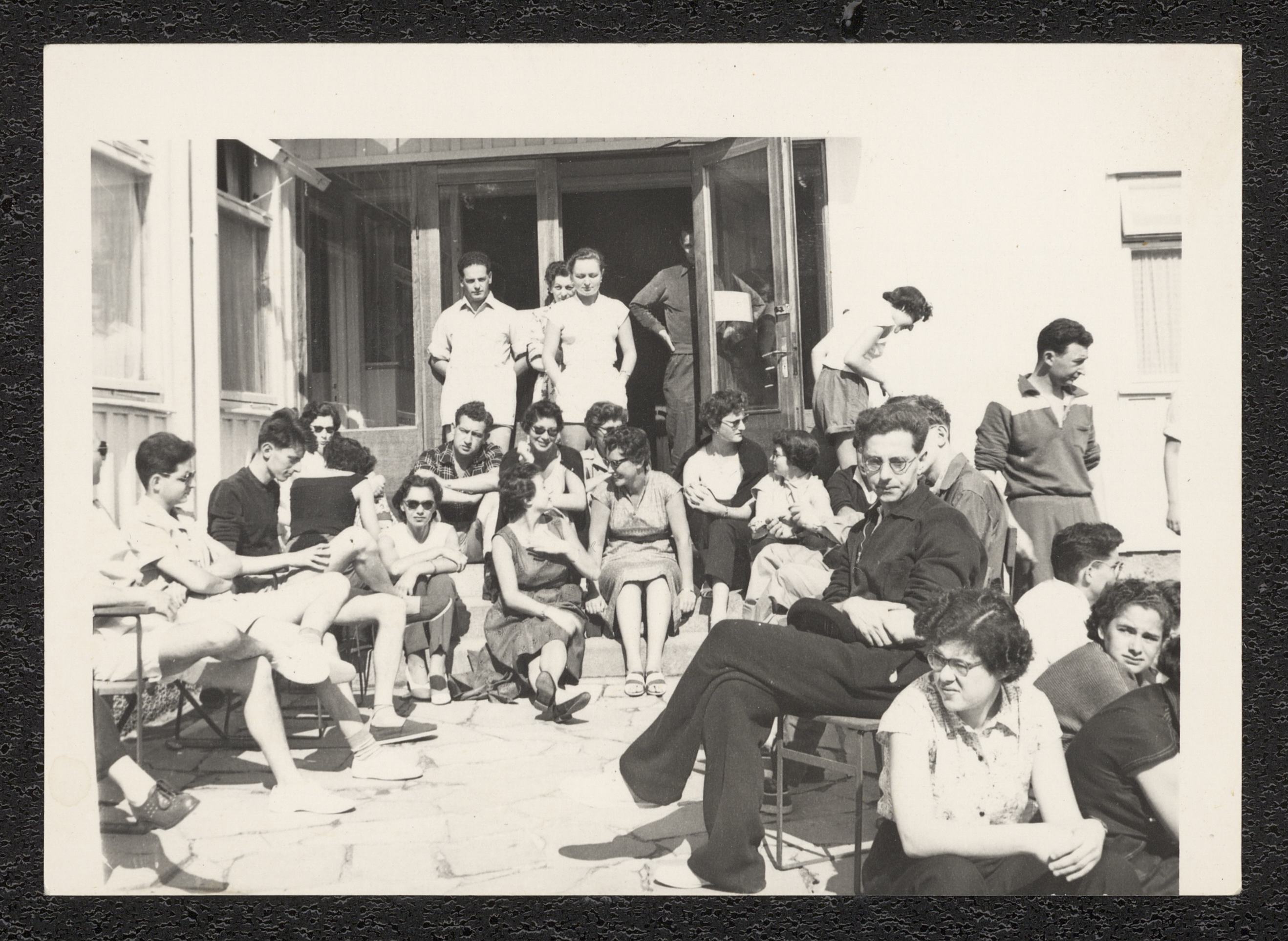 En samling människor sitter utanför en entré, på trappor och i stolar. Några står i dörren. Bilden har tillhört Georg Witt och är troligen tagen vid en återträff i Uddevalla på 1950-talet. På baksidan finns texten "Uddevalla -54".
