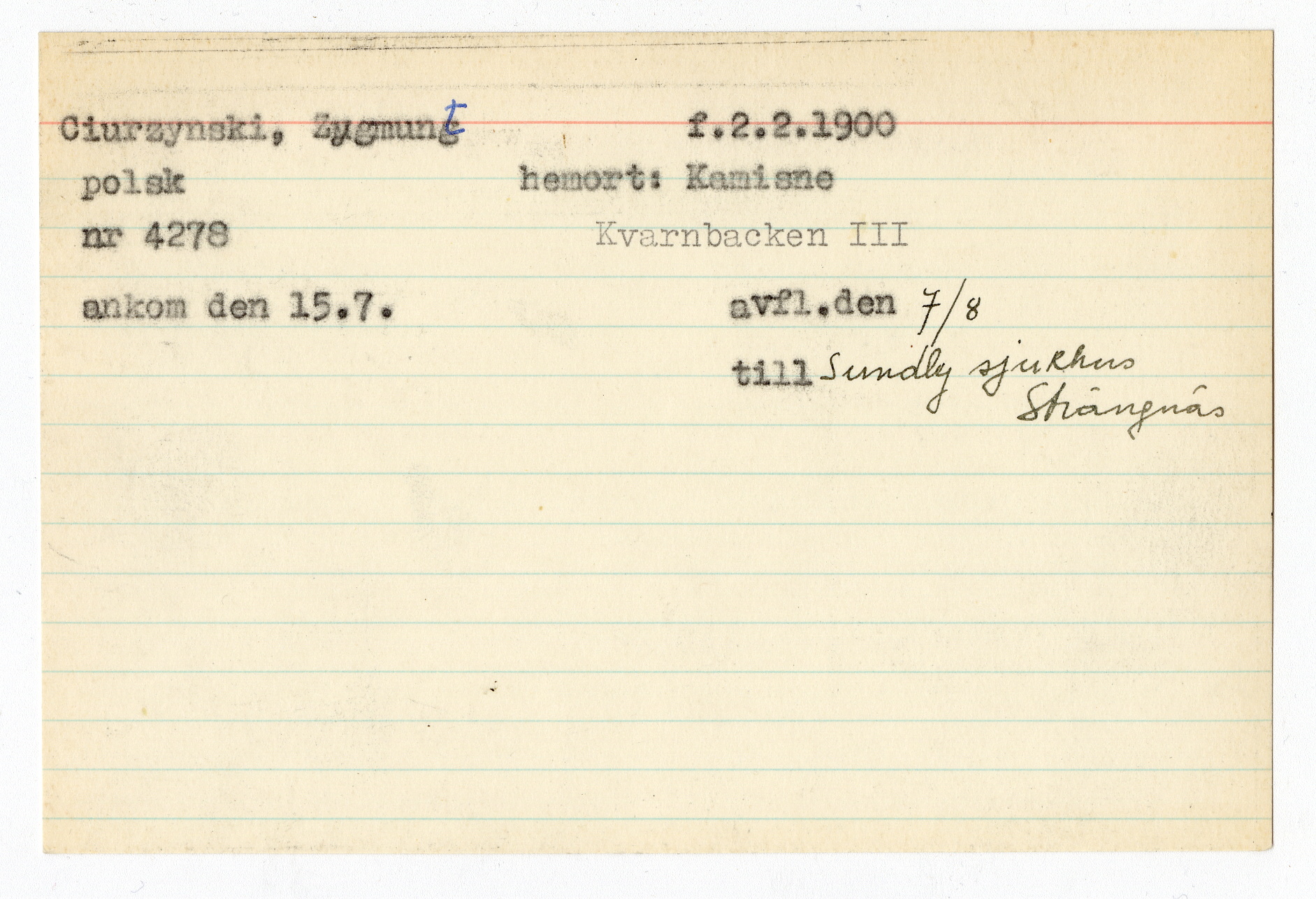 Ett skrivkort med patientuppgifter gällande Zygmunt Ciurzynski.