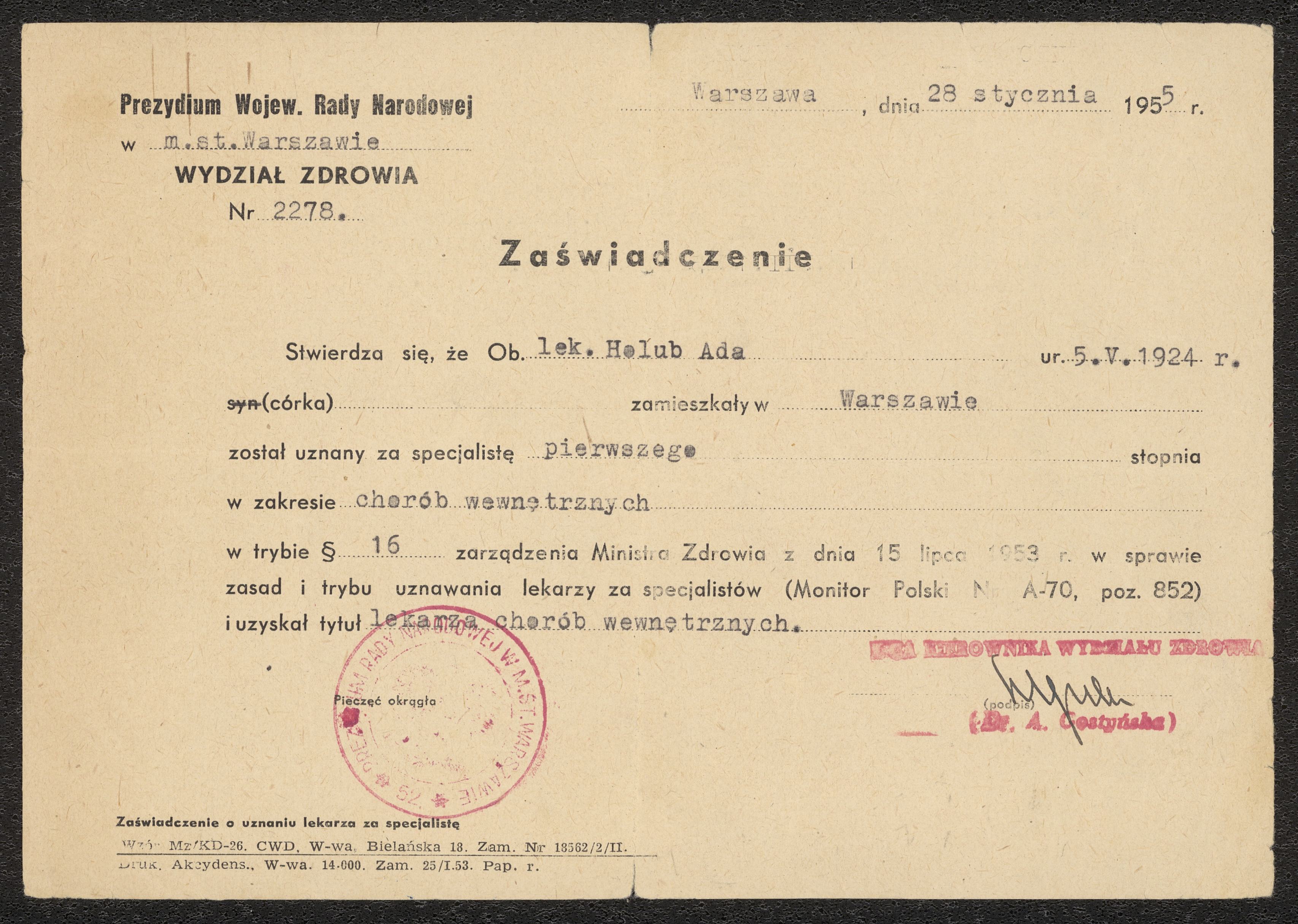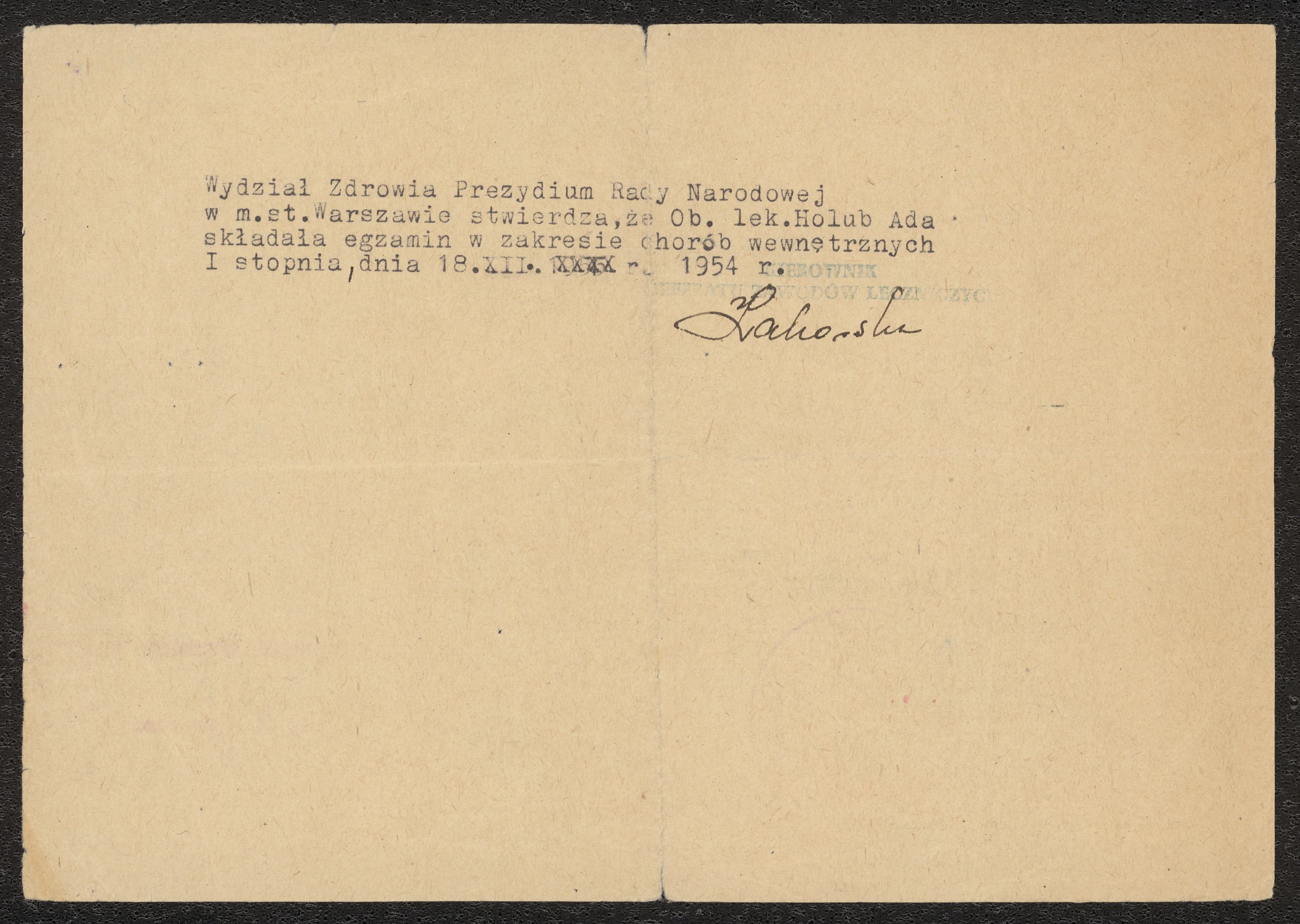Polskt läkarcertifikat för Ada Holub 1955