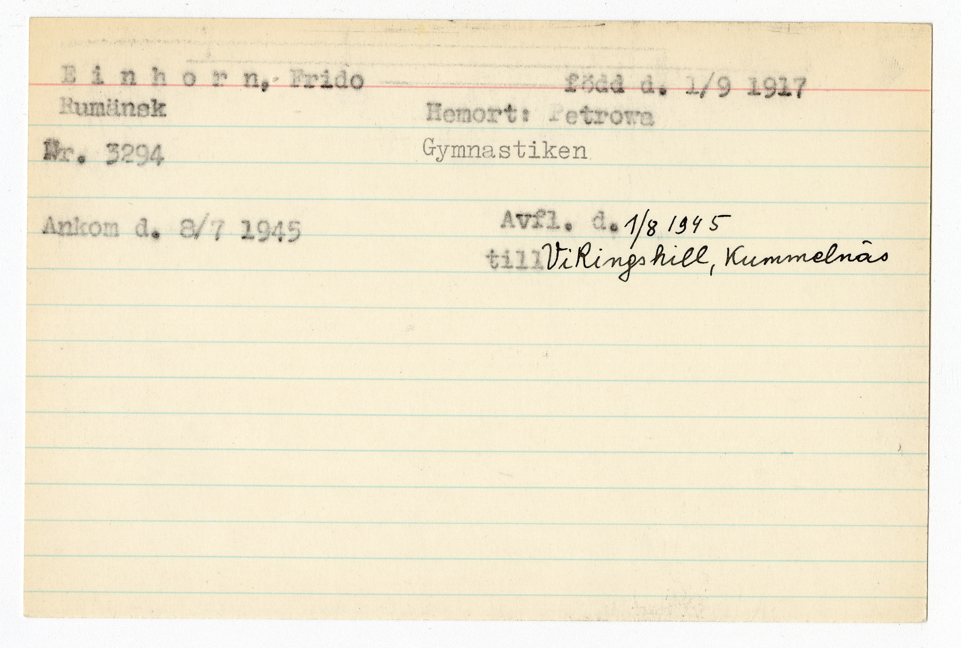 Ett skrivkort med patientuppgifter gällande Frido Einhorn.