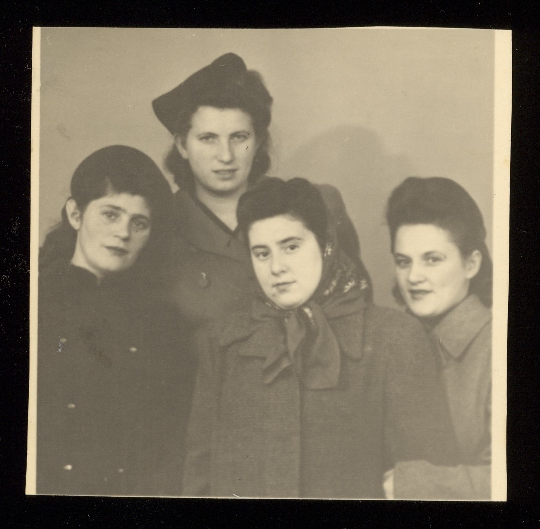 Grupporträtt av fyra kvinnor. Kvinnan längst till vänster är troligen Sala Zoltowska, senare Sara Säll. Till höger om henne, lite bokom de andra, står Franja Nilsson. Kvinnan längst till höger heter troligen Hanka. Kvinnorna lärde troligen känna varandra i repatrianlägret på Visingsö, där de alla var bekanta med Rosa Ebel (senare Gustafsson), som är fotografiets ursprungliga ägare.