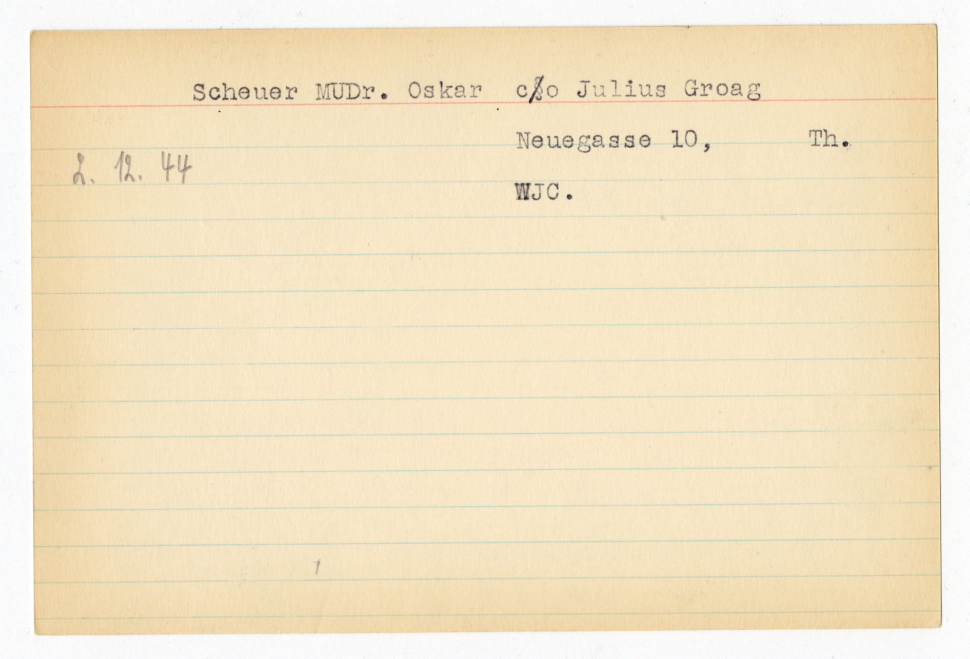 Ett skrivkort med patientuppgifter gällande Helena Aronowicz. På baksidan uppgifter om matpaket till Oskar Scheuer i Theresienstadt.
