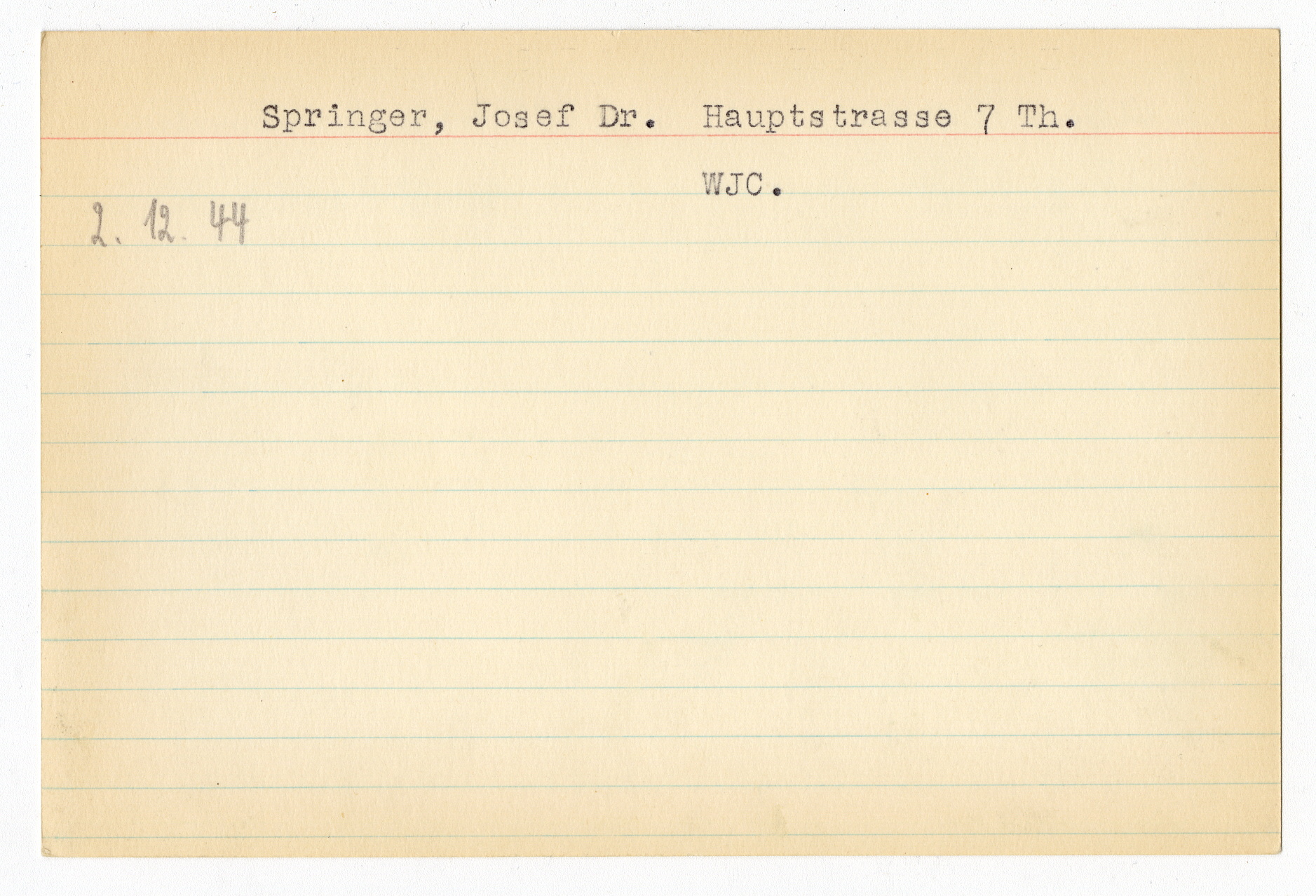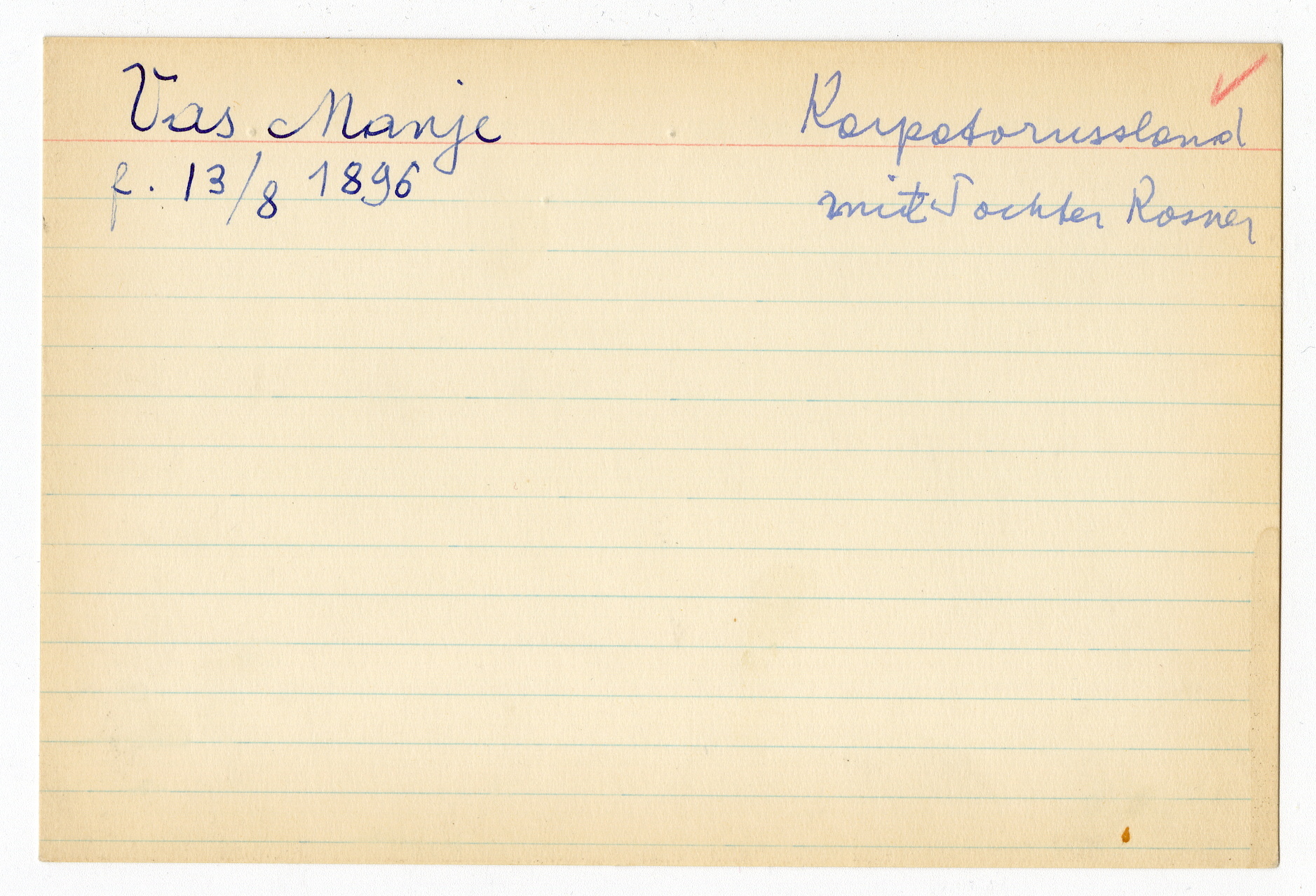 Ett skrivkort med patientuppgifter gällande Manyi Vas. På baksidan uppgifter om matpaket till Josef Springer i Theresienstadt.