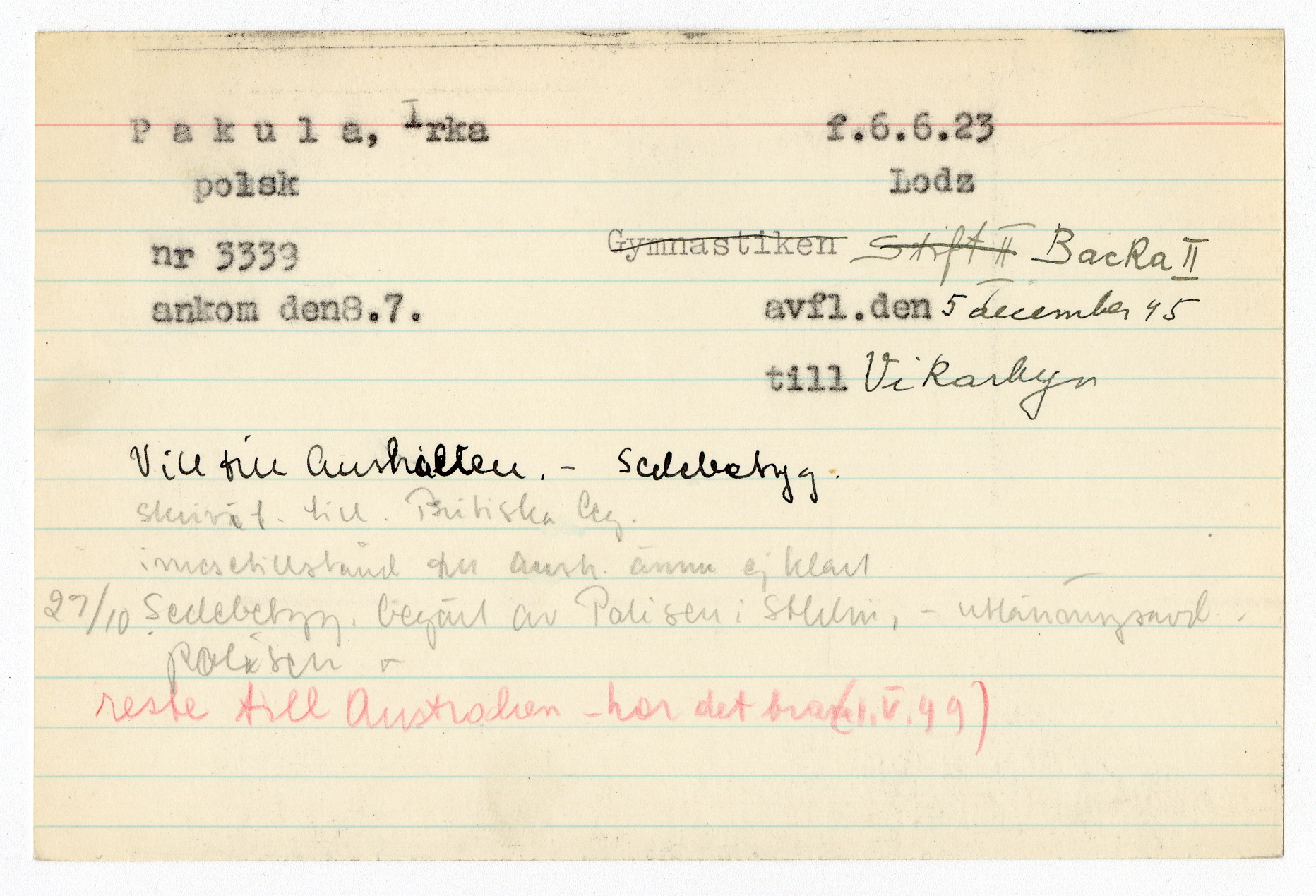 Ett skrivkort med patientuppgifter gällande Irka Pakula.