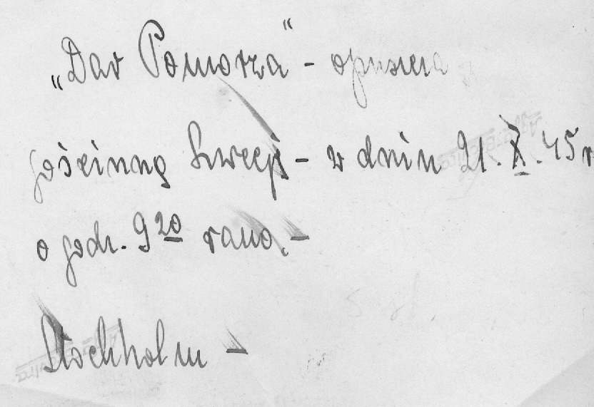 Fotografi av skeppet Dar Pomorza som lämnar Sverige, 21 oktober 1945, påväg mot Gdynia och Polen. De polska marinsoldaterna som kommit till Sverige med skeppet och de tre ubåtarna hade då varit internerade i Sverige under sex år, i väntan på freden och möjligheten att vända hemåt. Wanda Gasiorowskas dotter berättar att Wanda med säkerhet åskådade alla de polska skeppen som lämnade Sverige vid den tiden, eftersom hennes nya kärlek Józef reste åter till Polen. På baksidan av fotografiet har Wanda skrivit en anteckning på polska: "Dar Pomorza lämnar det gästvänliga Sverige 21 oktober 1945 klockan 9:20 på morgonen".