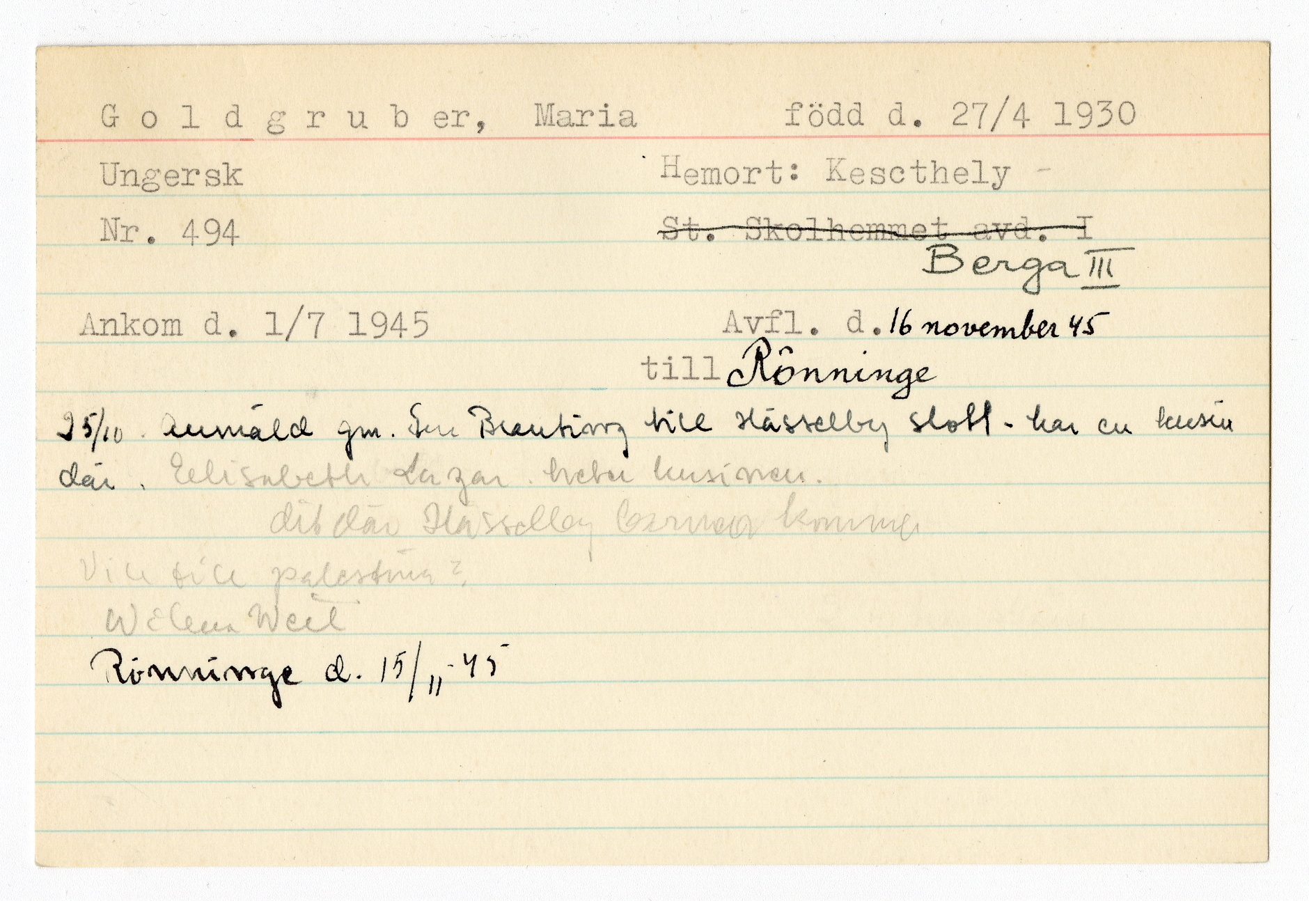 Ett skrivkort med patientuppgifter gällande Maria Goldgruber.