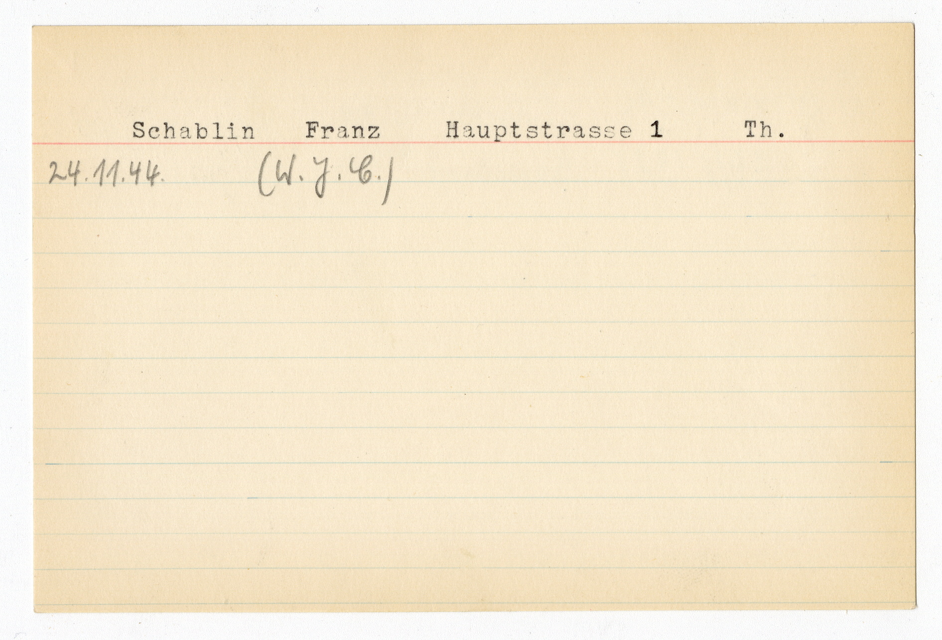 Ett skrivkort med patientuppgifter gällande Hanna Dombeck. På baksidan uppgifter om matpaket till Franz Schablin i Theresienstadt.