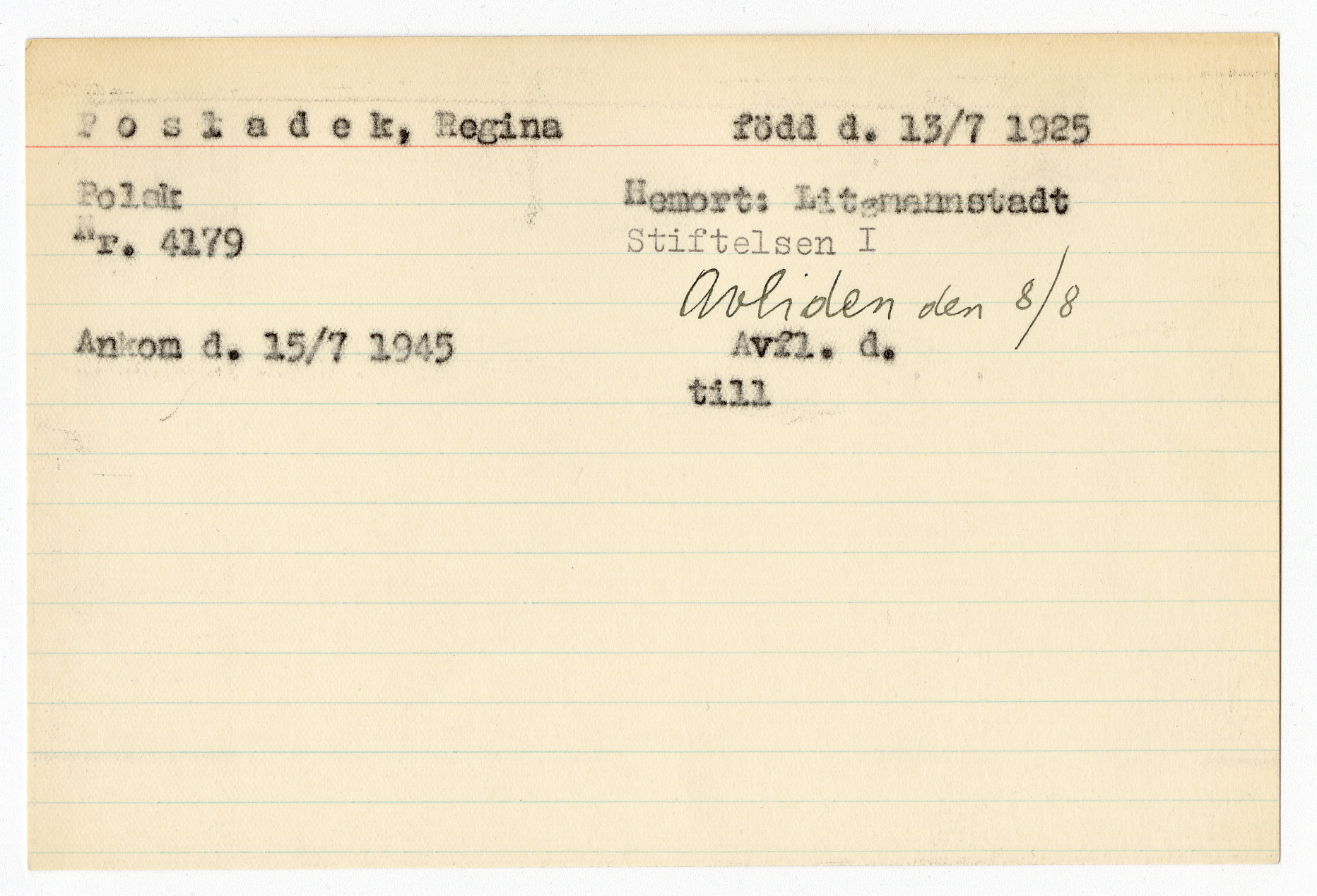 Ett skrivkort med patientuppgifter gällande Regina Posladek.