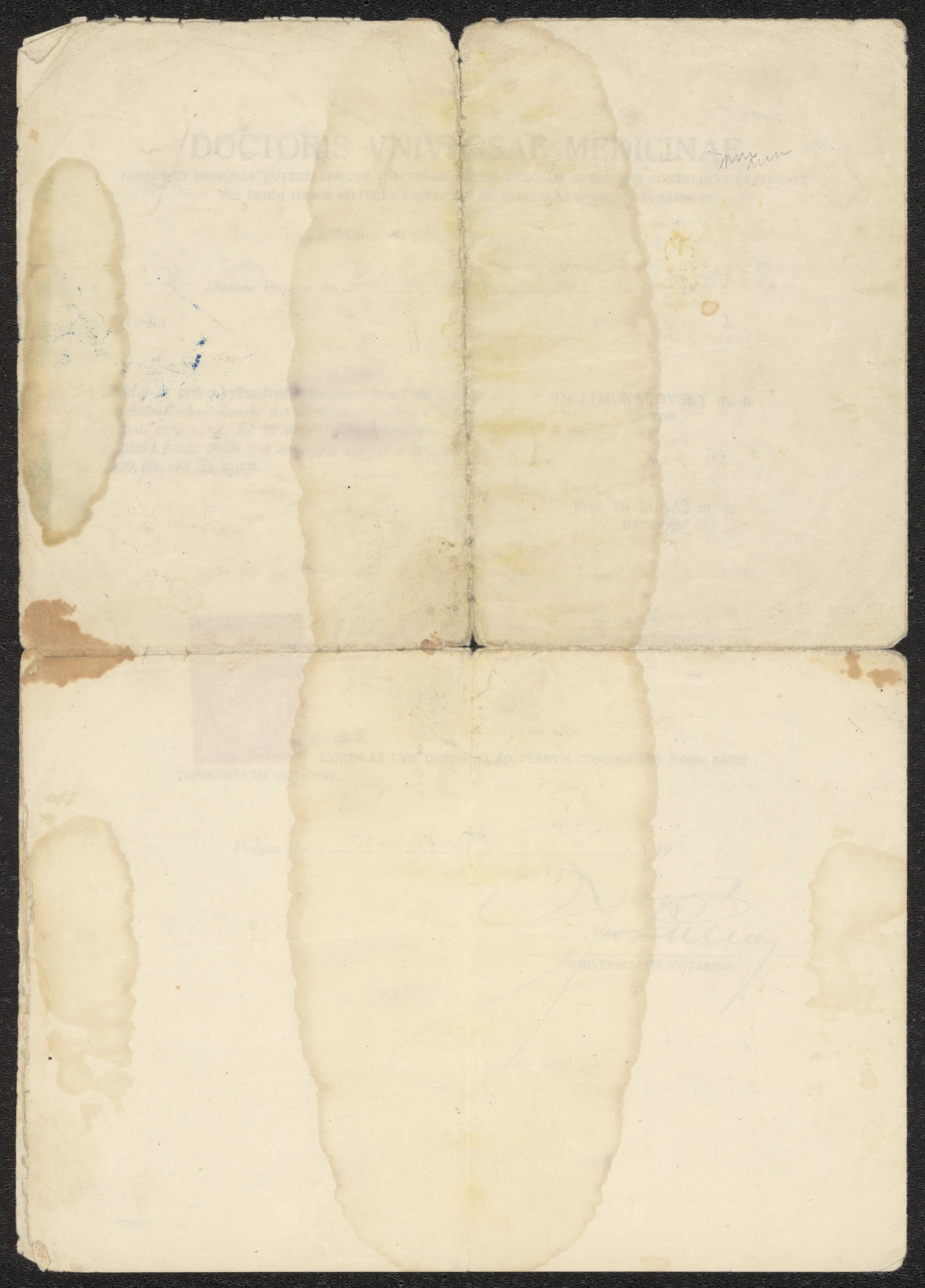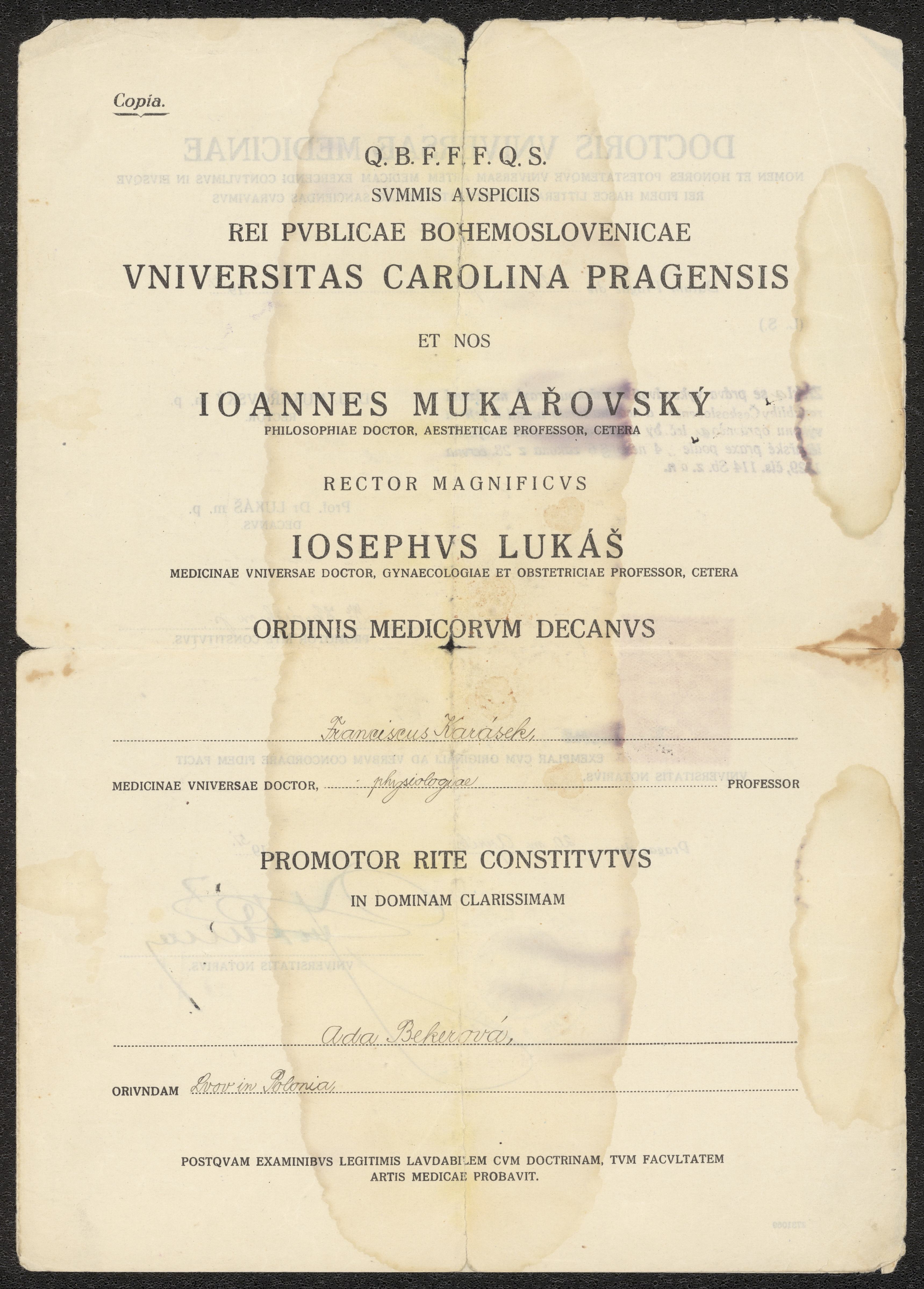 Doktorsexamensbevis för Ada Becker från Karlsuniversitetet i Prag.