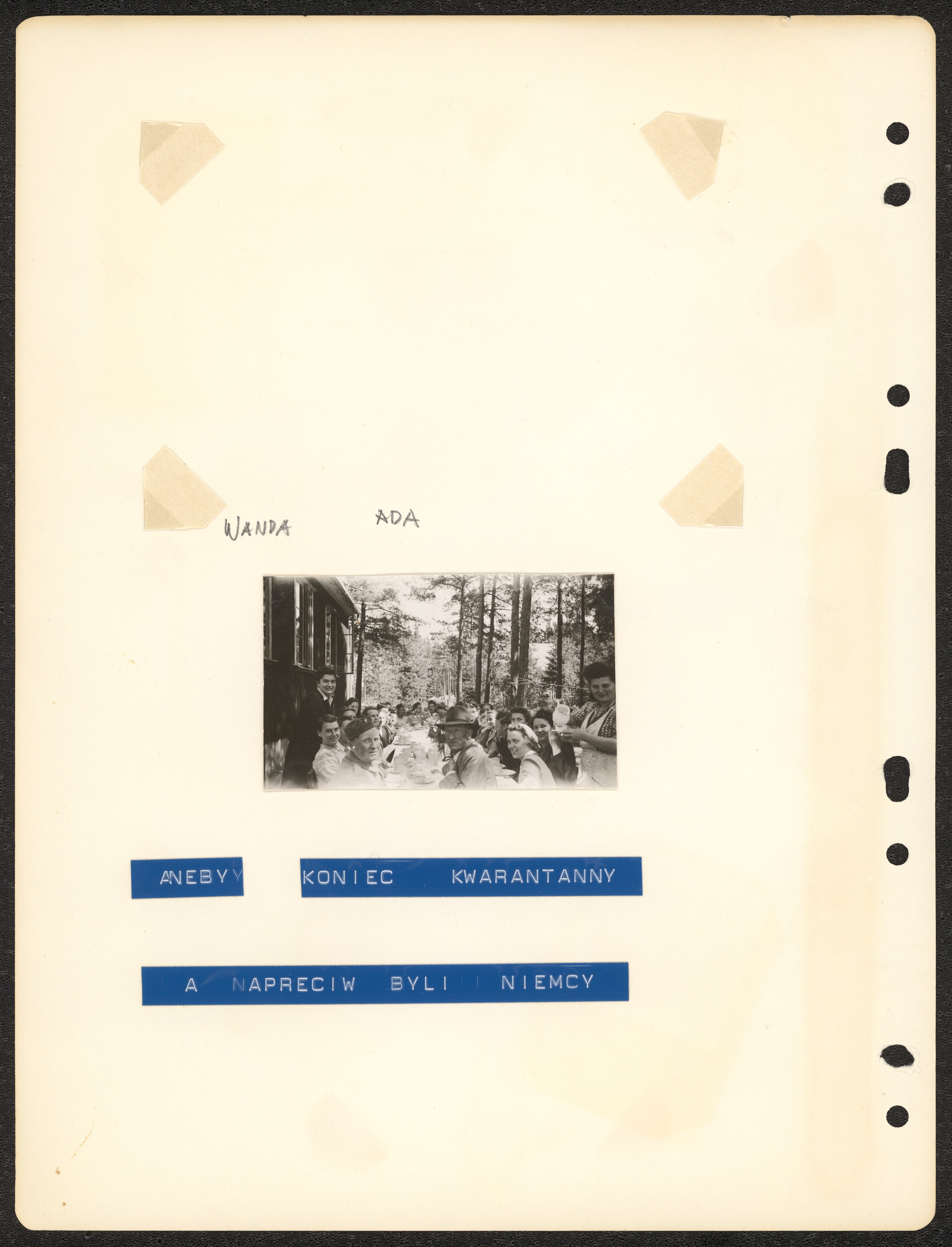 Albumsida från Ada Beckers fotopärm. På albumsidans framsida sitter sju fotografier som skildrar Ada Beckers tid i repatriandläger, troligen Aneby. På baksidan tre fotografier samt texten "Aneby, Koniec Kwaranranny a napreciew byli niemcy".