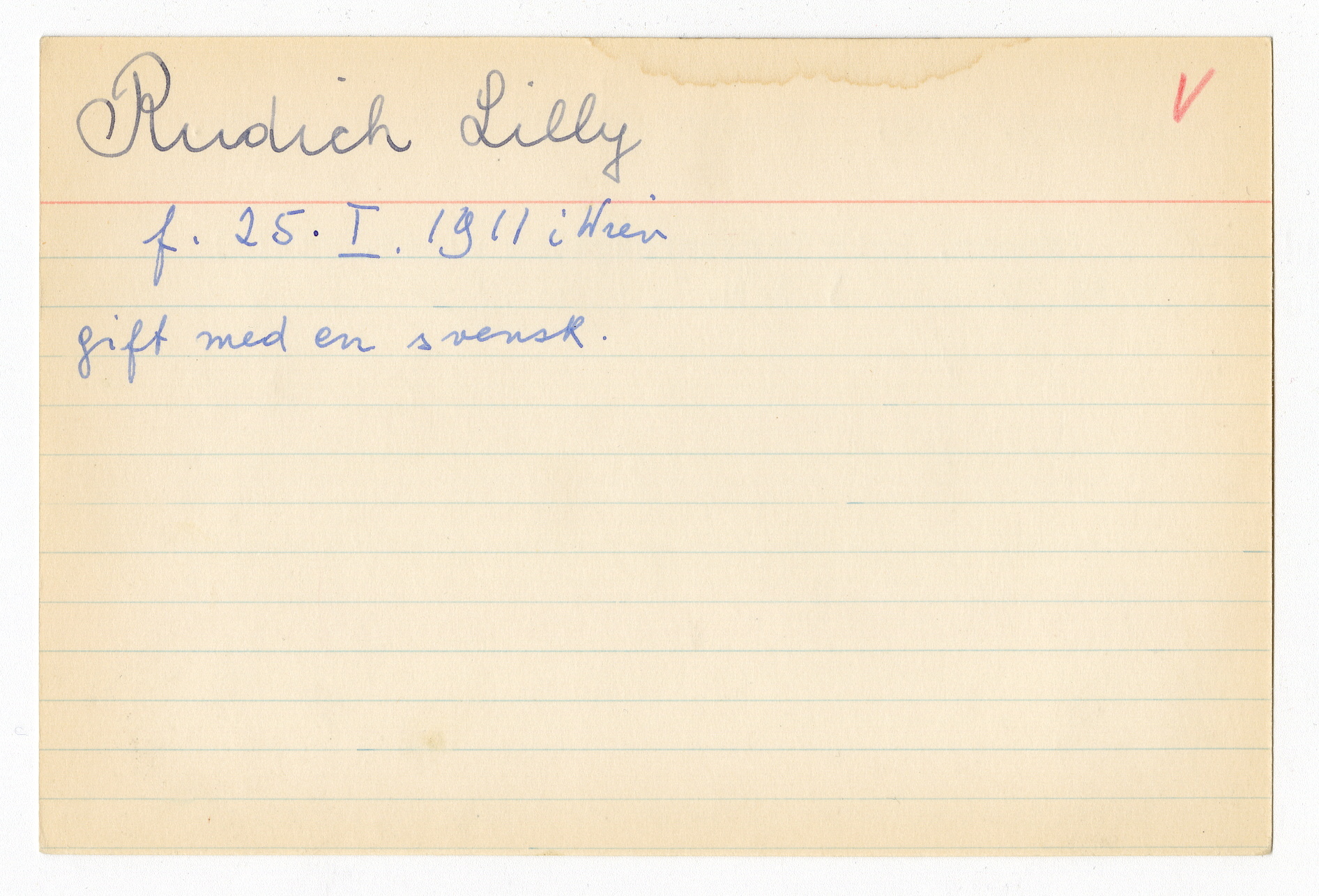 Ett skrivkort med patientuppgifter gällande Lilly Rudich. På baksidan uppgifter om matpaket till Lina Steinweg i Theresienstadt.