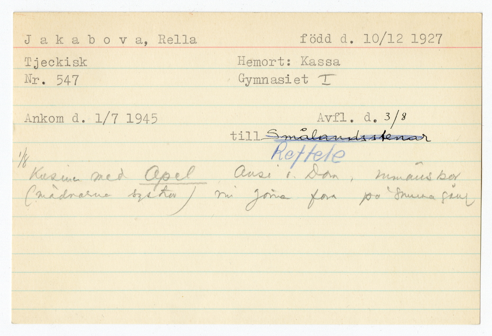 Ett skrivkort med patientuppgifter gällande Rella Jakabova.