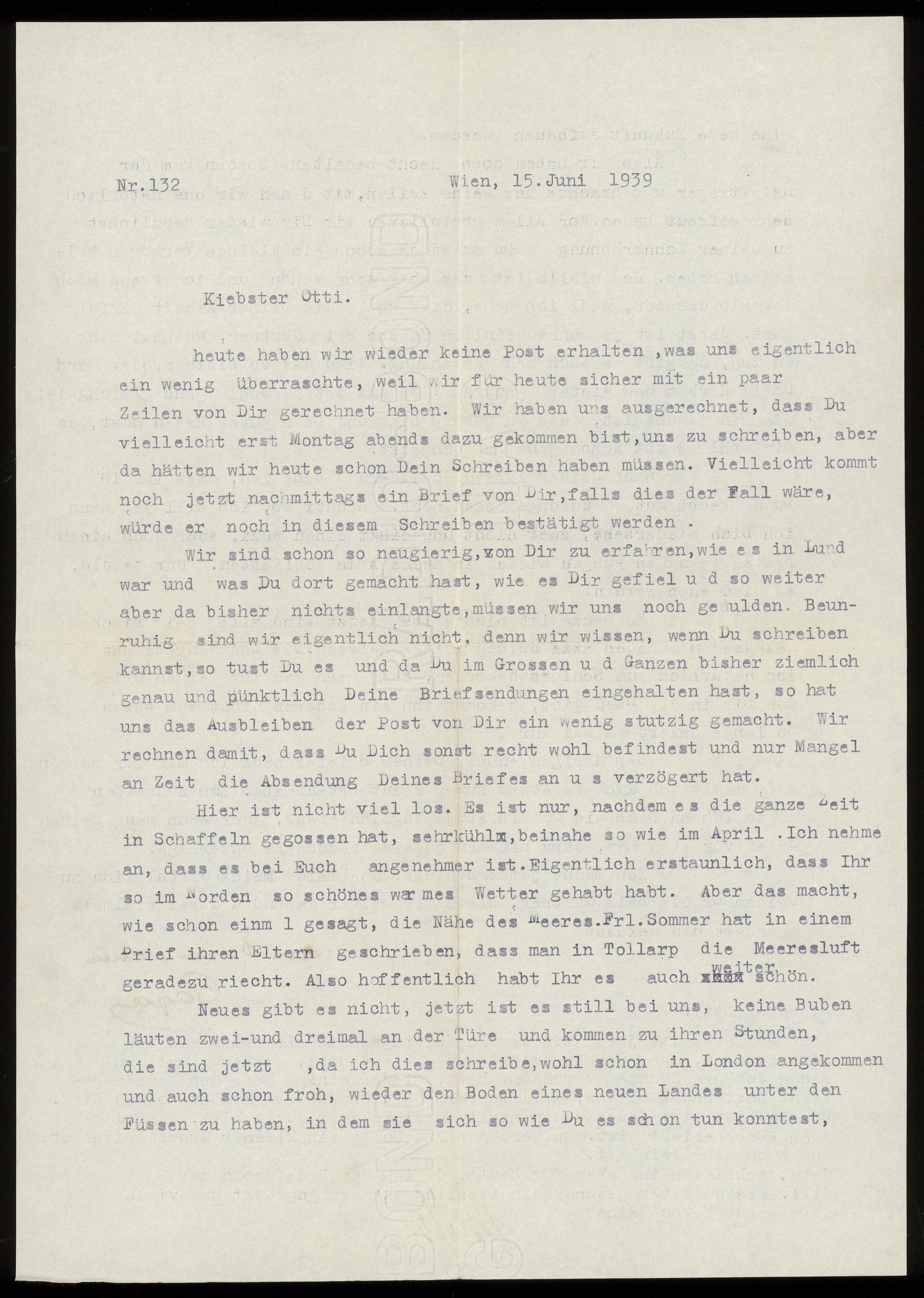 Maskinskrivet brev till Otto Ullman från föräldrarna Josef och Elise Ullmann daterat 15 juni 1939 Wien.