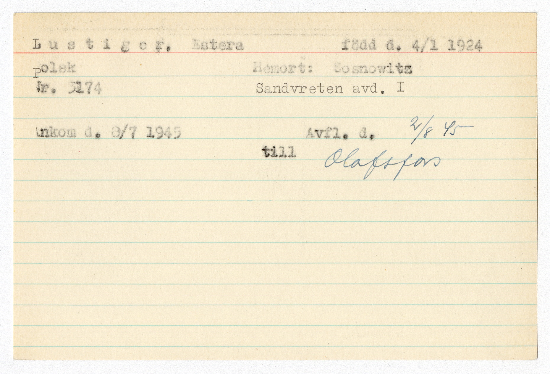 Ett skrivkort med patientuppgifter gällande Estera Lustiger.