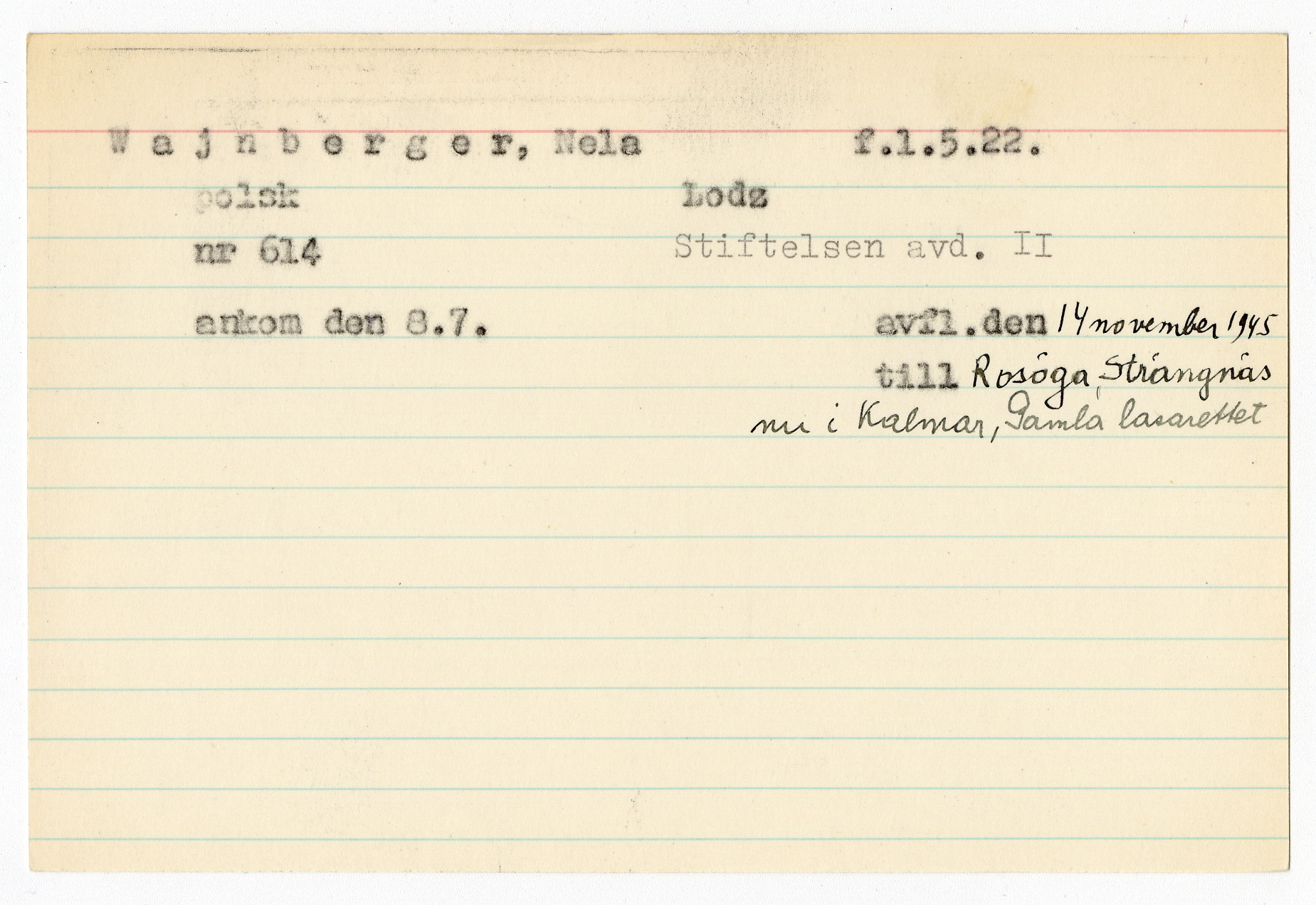 Ett skrivkort med patientuppgifter gällande Nela Wajnberger.