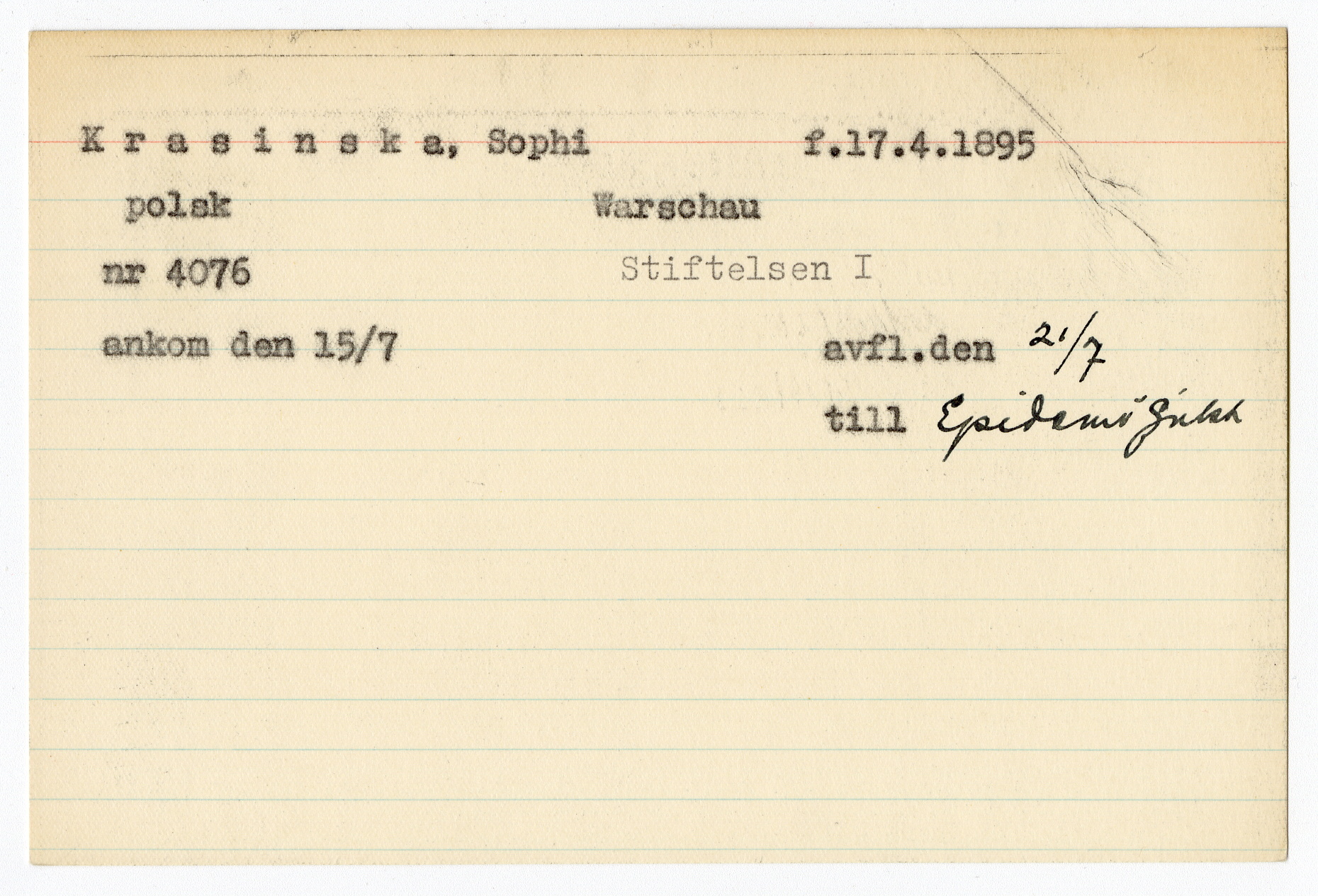 Ett skrivkort med patientuppgifter gällande Sophi Krasinska.