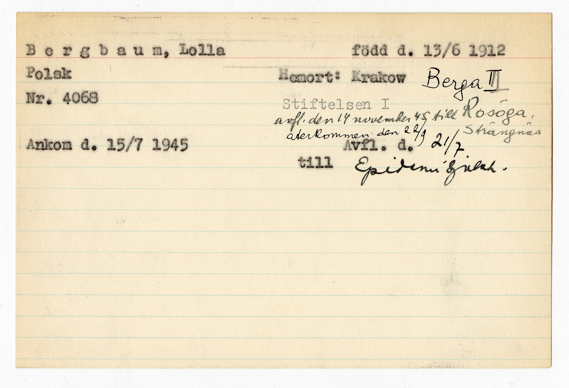 Ett skrivkort med patientuppgifter gällande Lolla Bergbaum.