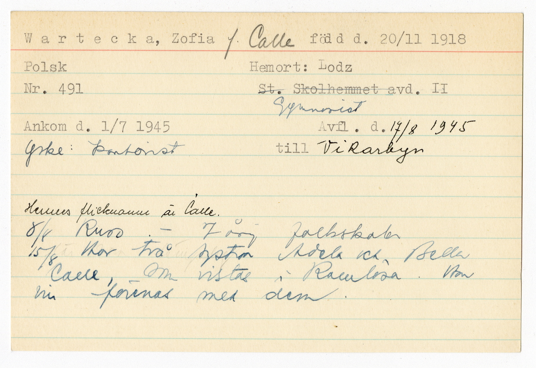 Registerkort Zofia Wartecka f. Calle