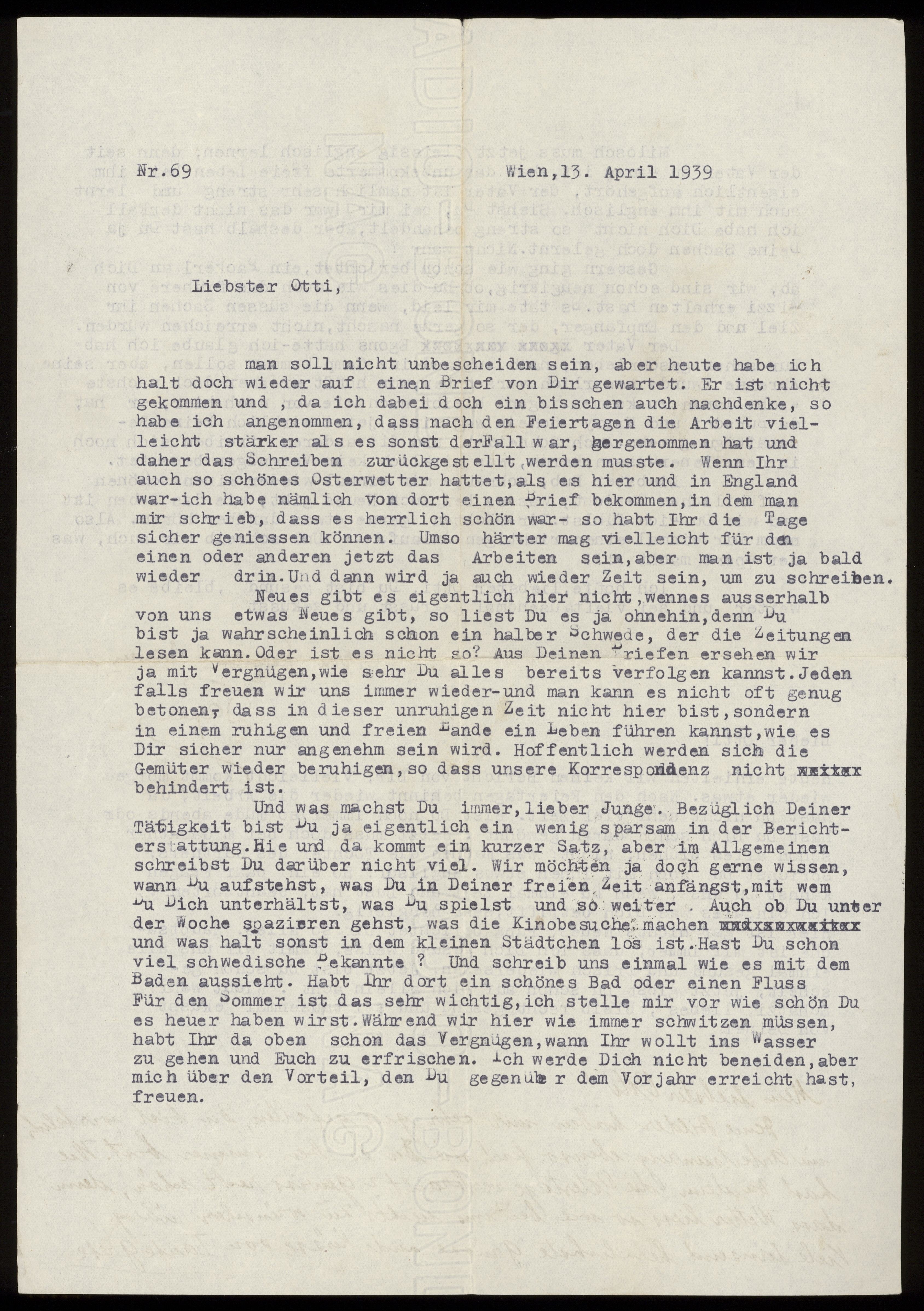 Maskinskrivet brev till Otto Ullman från föräldrarna Josef och Elise Ullmann och moster Grete Kollmann daterat 13 april 1939 Wien.