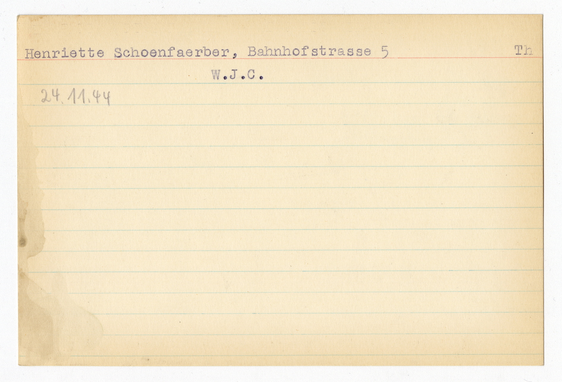 Ett skrivkort med patientuppgifter gällande Luba Keller. På baksidan uppgifter om matpaket till Henriette Schoenfaerber i Theresienstadt.