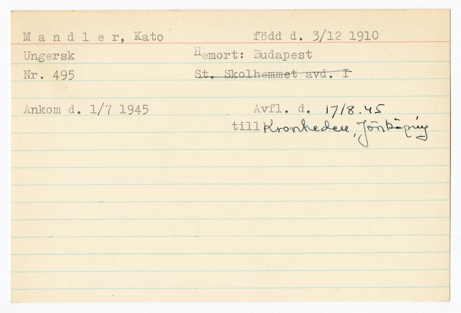 Ett skrivkort med patientuppgifter gällande Kato Mandler.