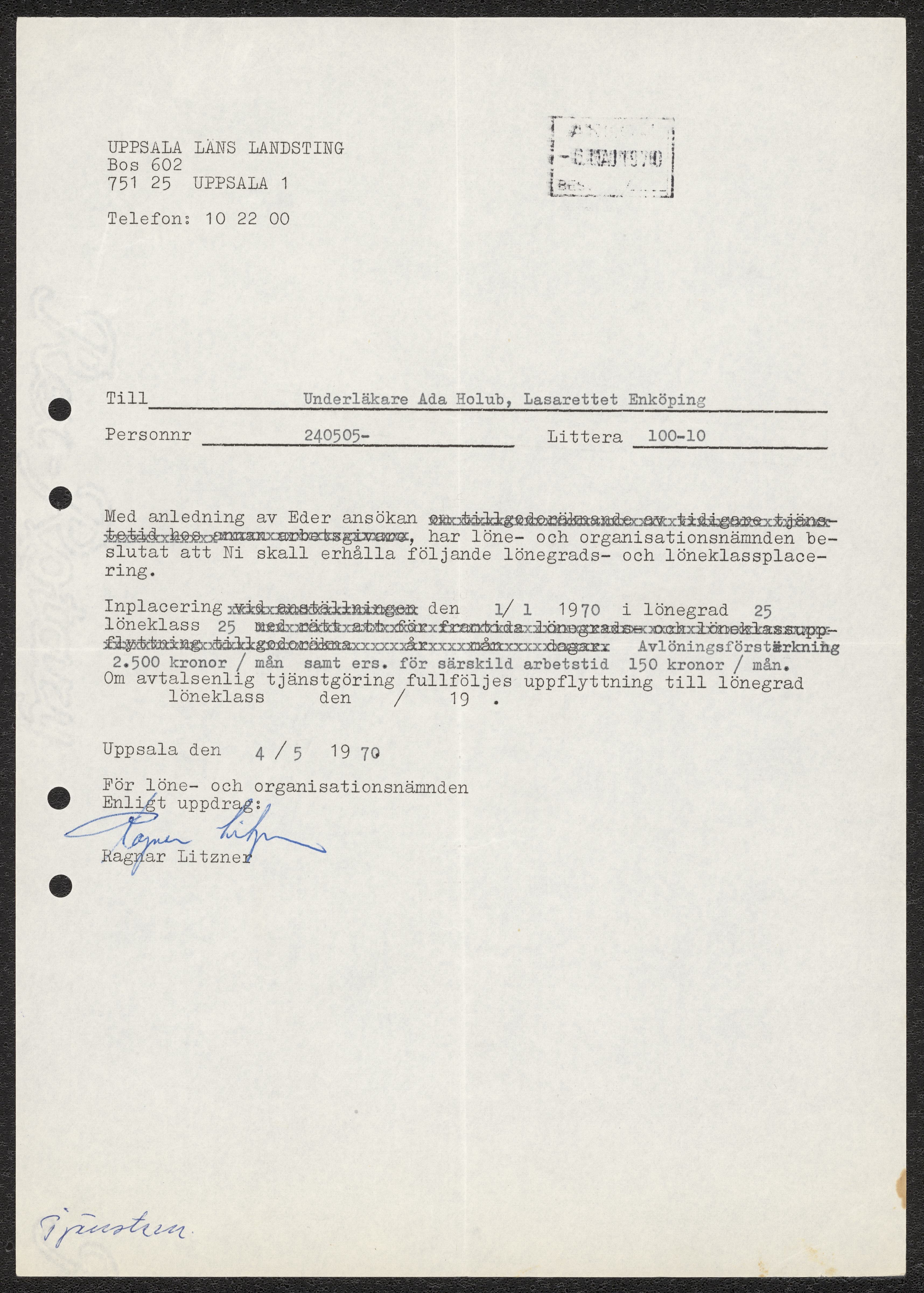 Meddelande om beslut om lönegrad för underläkare Ada Holub vid Lasarettet Enköping, 1970.