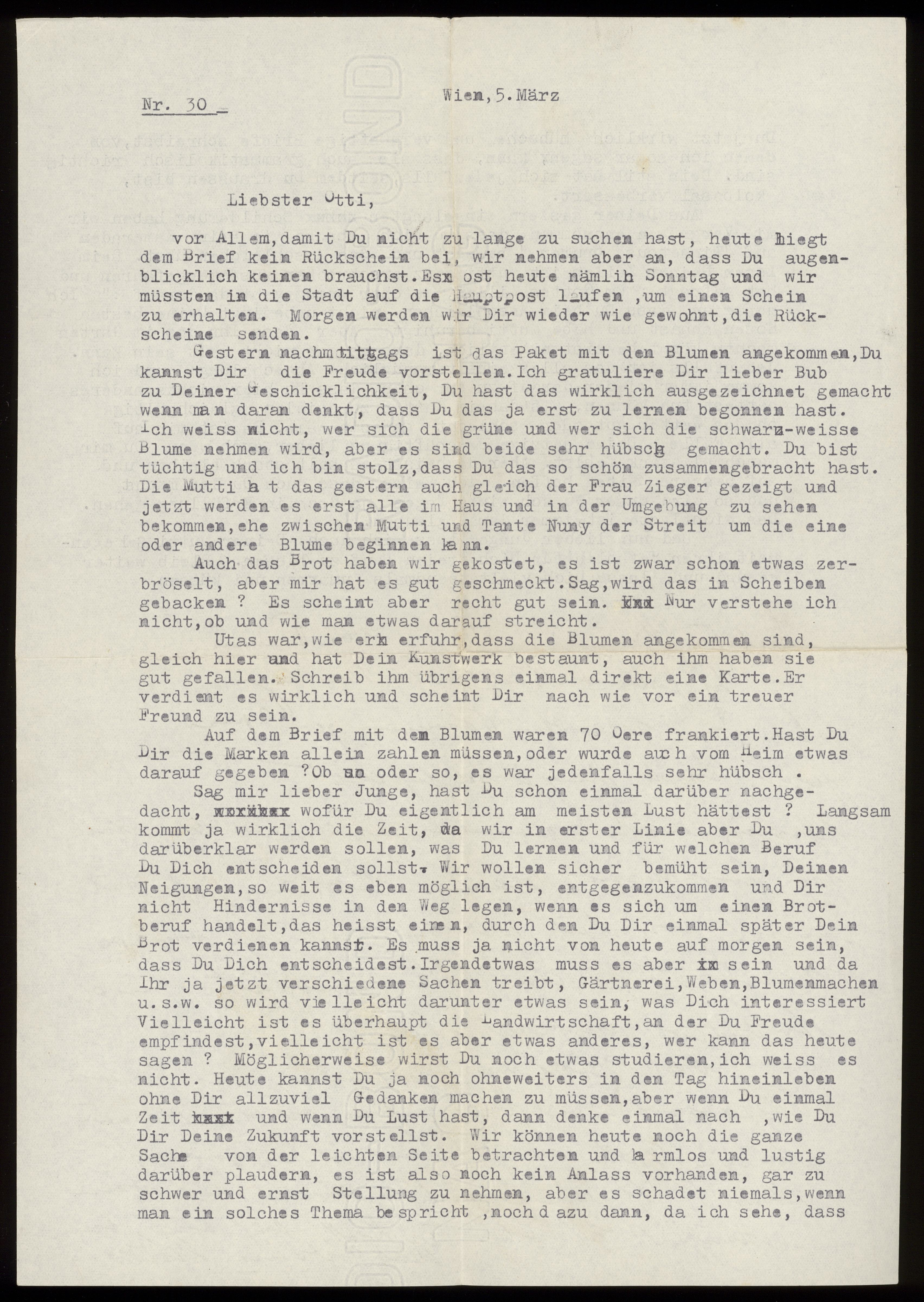 Maskinskrivet brev till Otto Ullman från föräldrarna Josef och Elise Ullmann daterat 5 mars 1939 Wien.