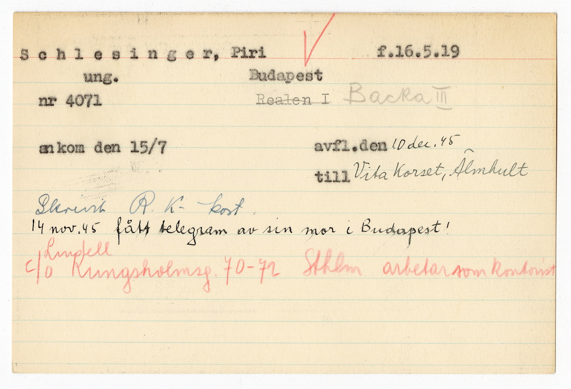 Registerkort Piri Schlesinger