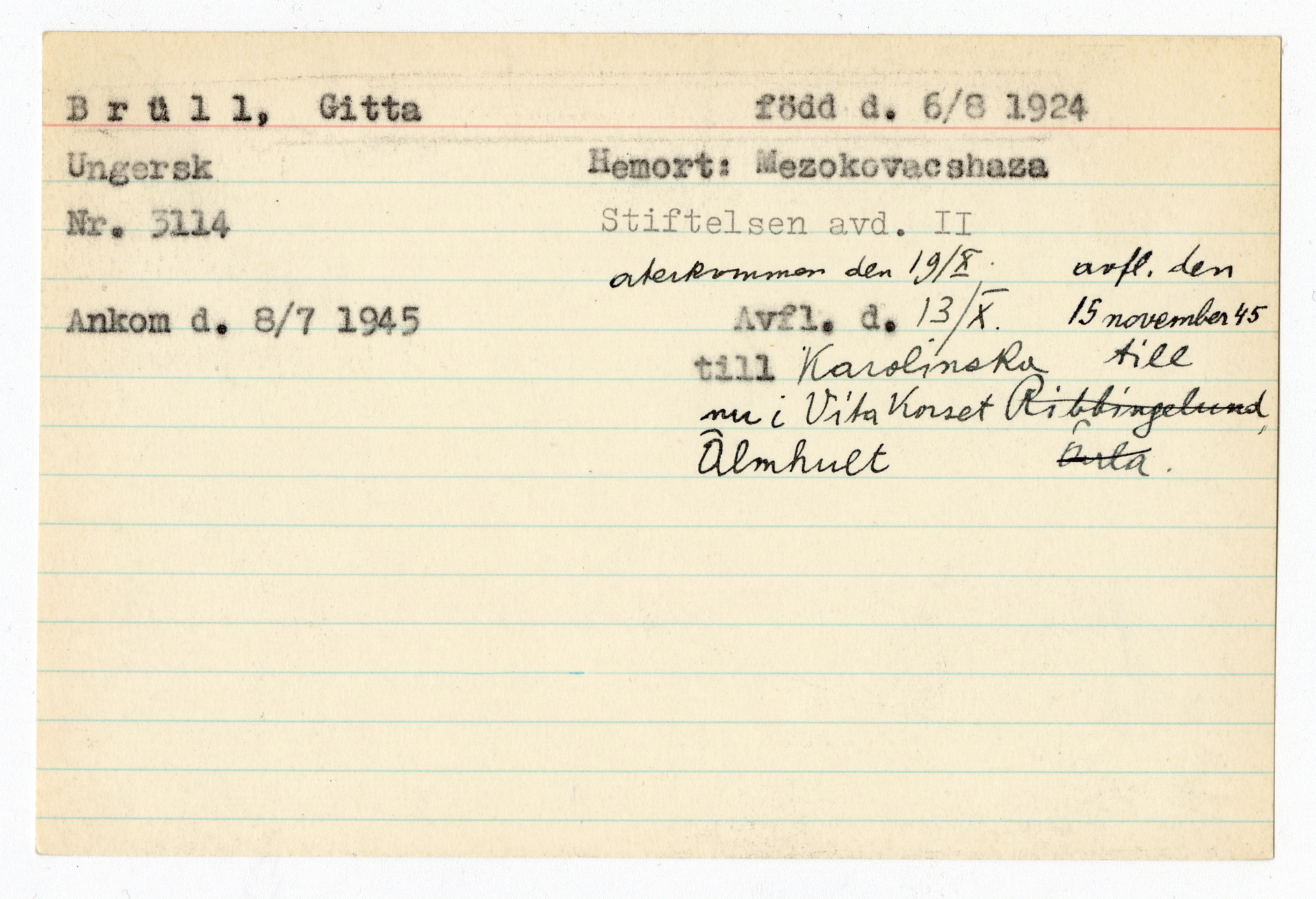 Ett skrivkort med patientuppgifter gällande Gitta Brüll.