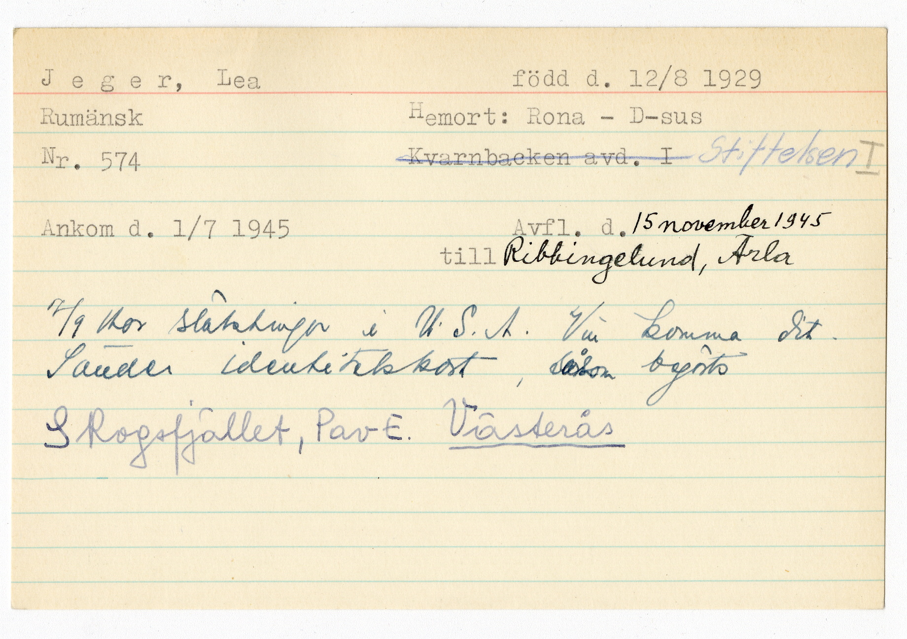 Ett skrivkort med patientuppgifter gällande Lea Jeger.