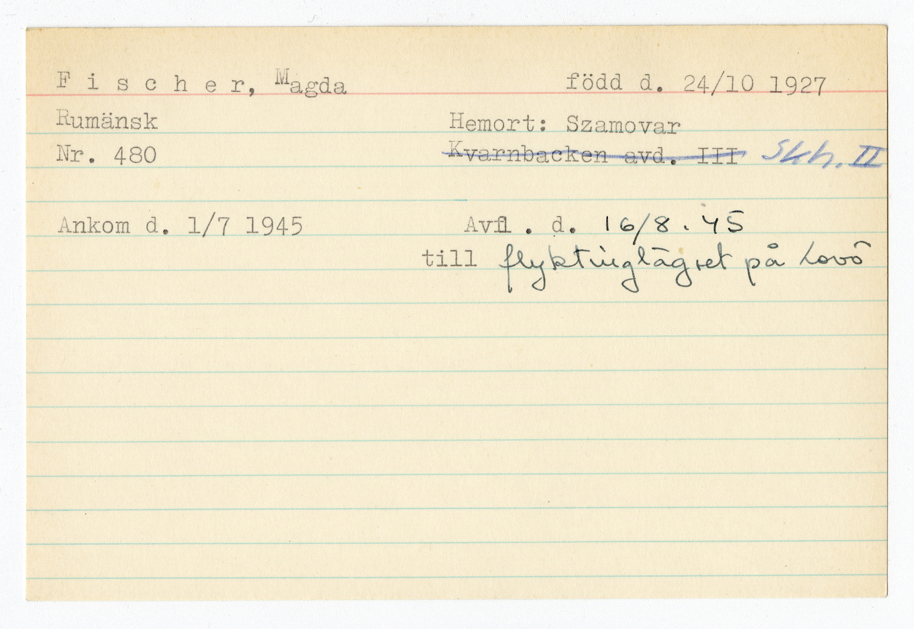 Ett skrivkort med patientuppgifter gällande Magda Fischer.