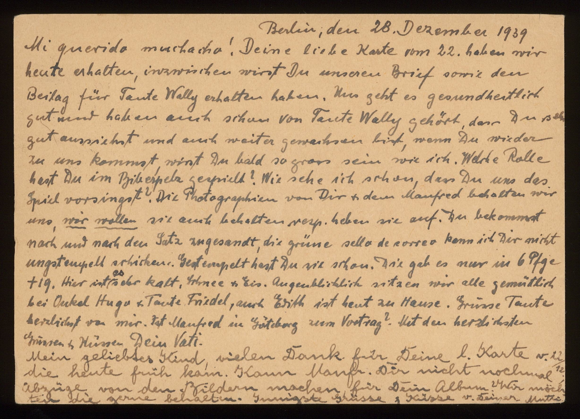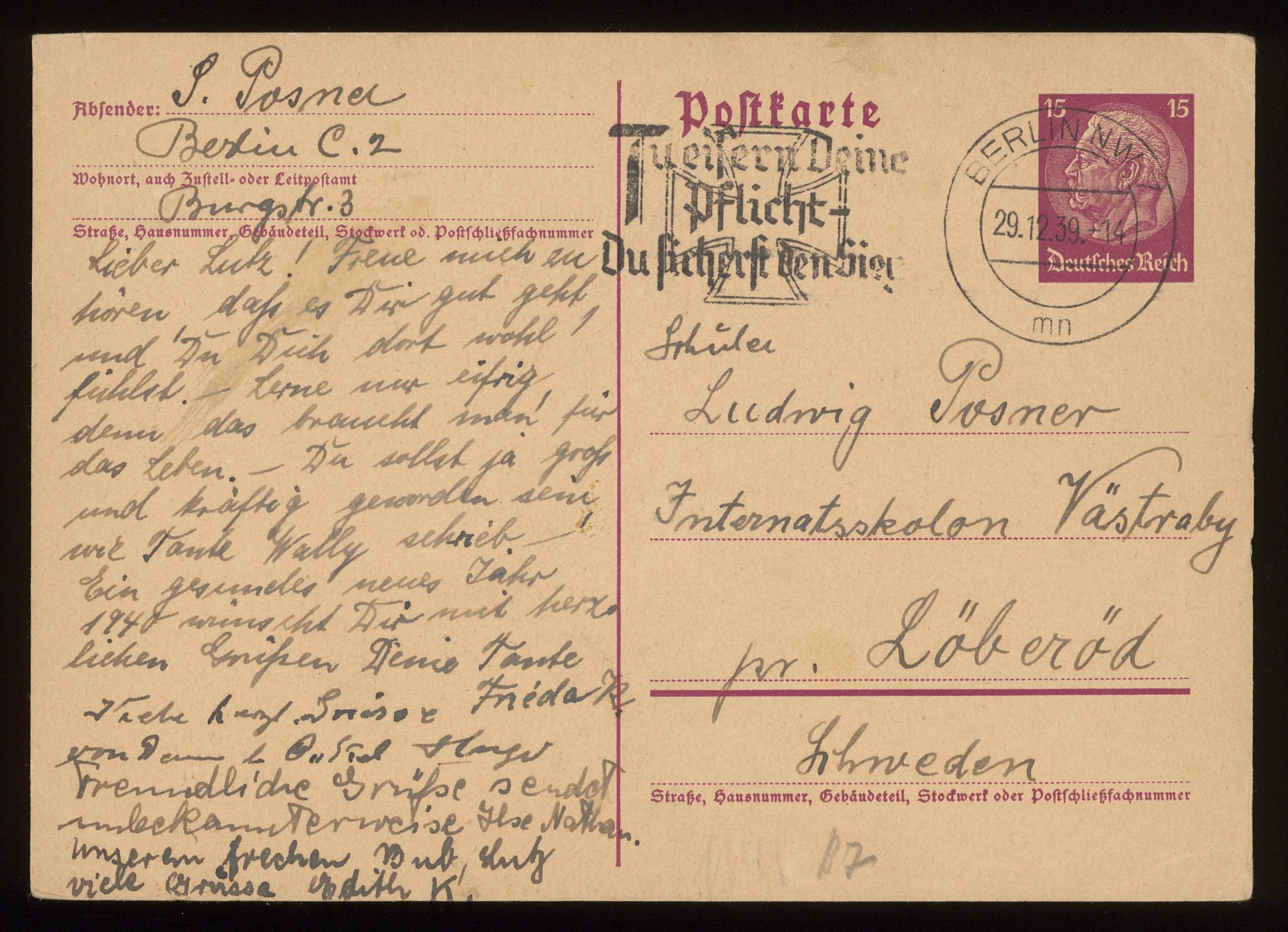 Brevkort från far Siegfried Posner, Tante Frieda och Edith K till Ludwig Posner daterat 28 december 1939.