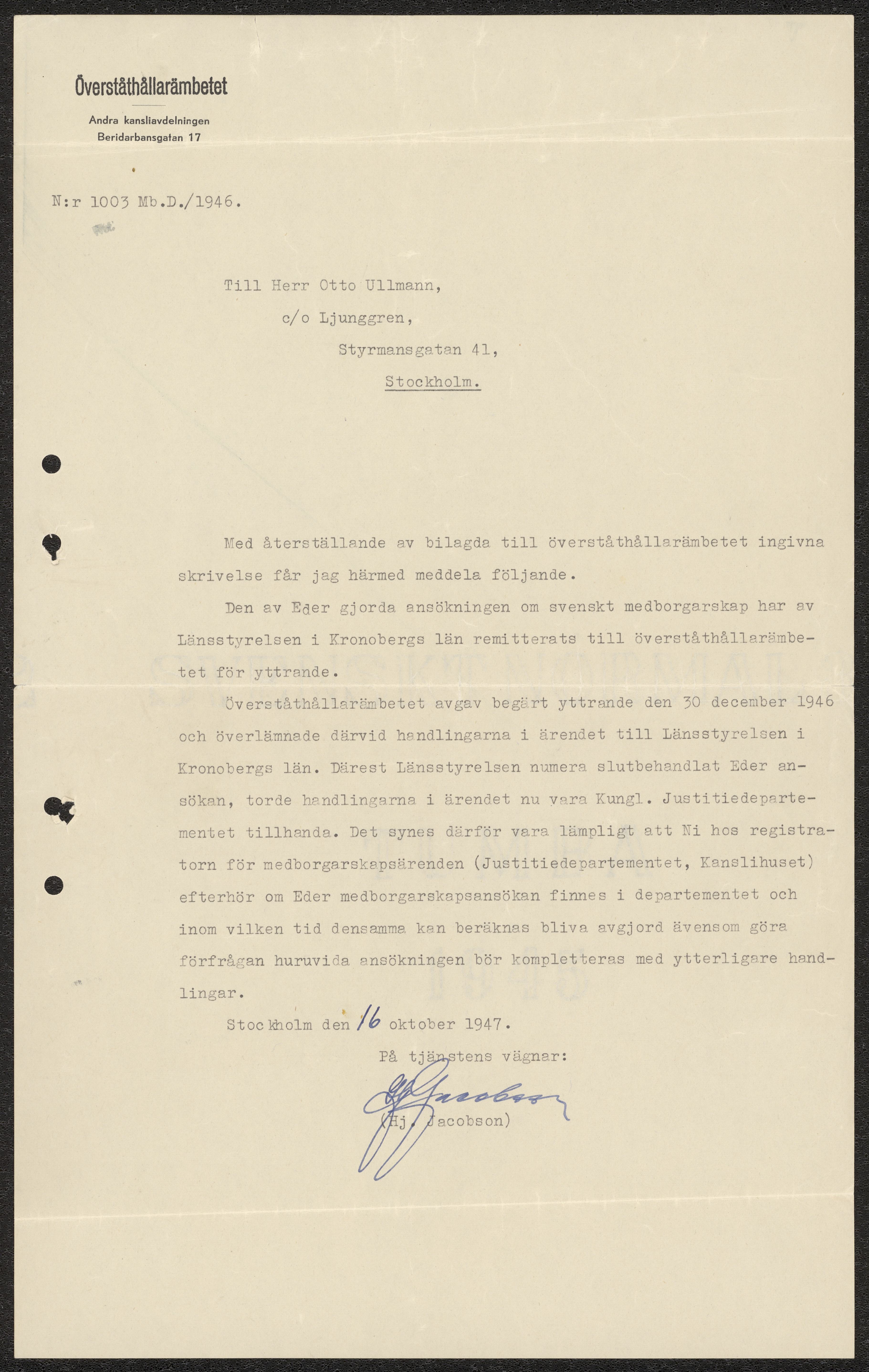 Officiellt brev från HJ. Jacobson på Överståthållarämbetet 16 oktober 1947 Stockholm.
