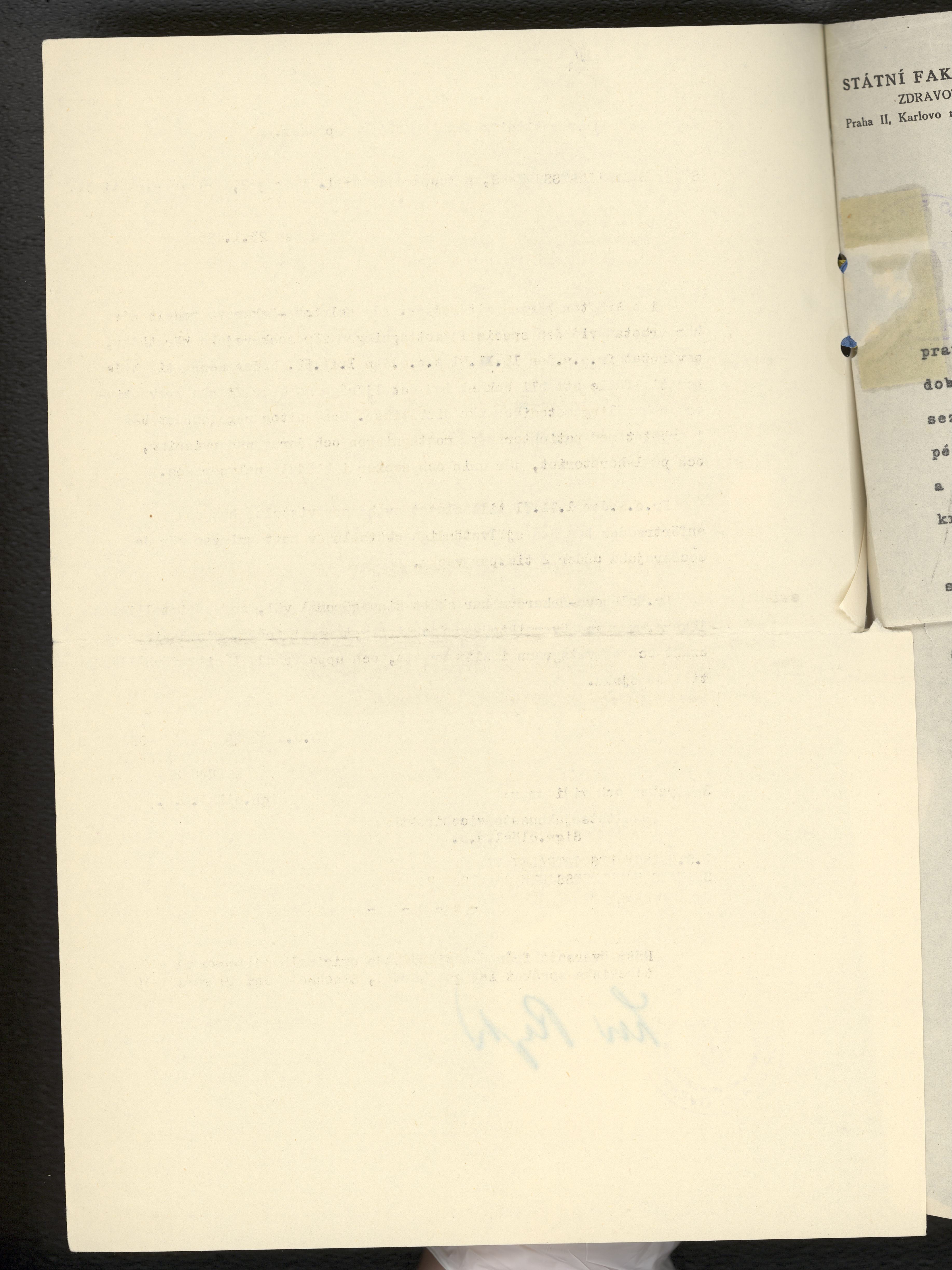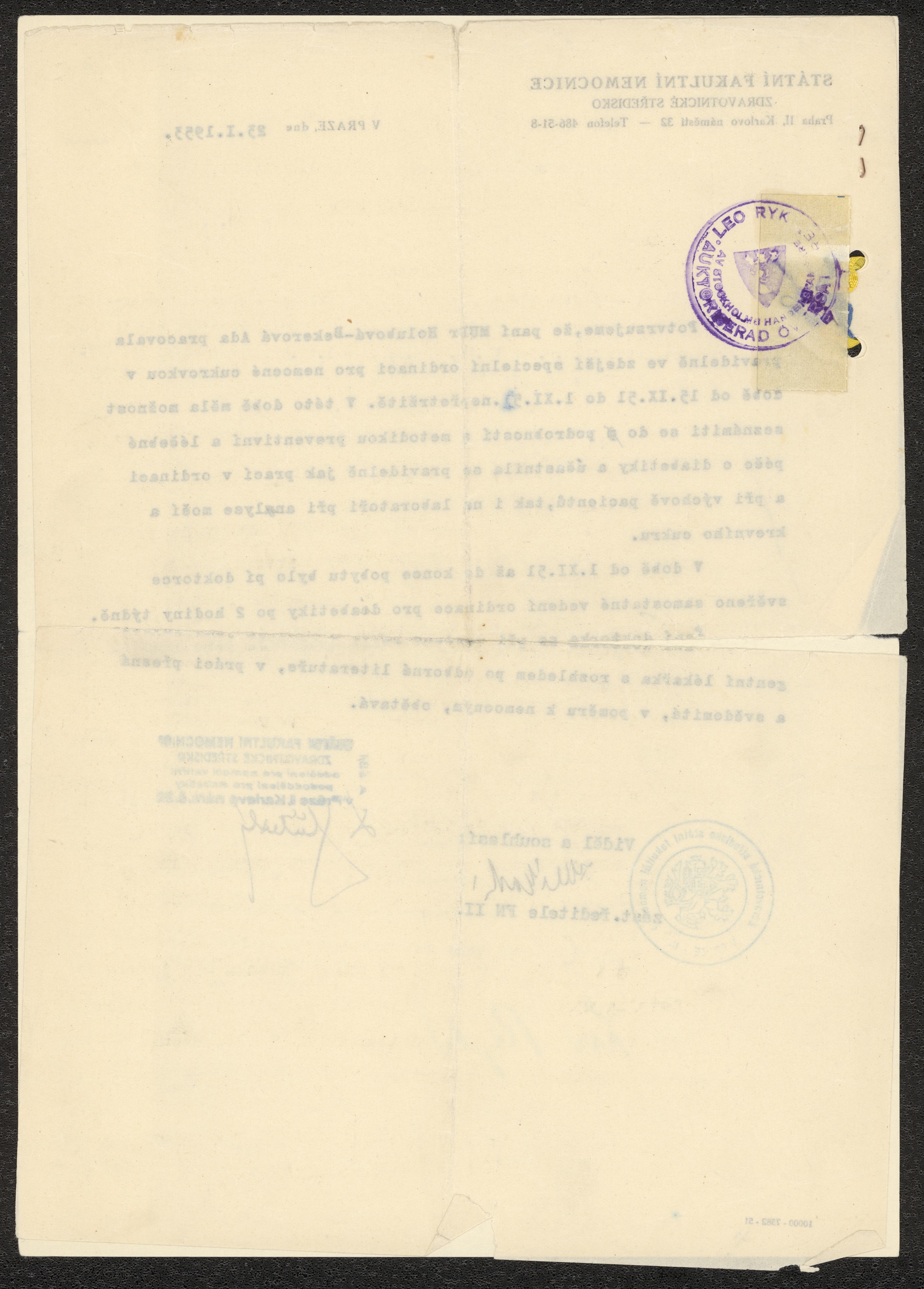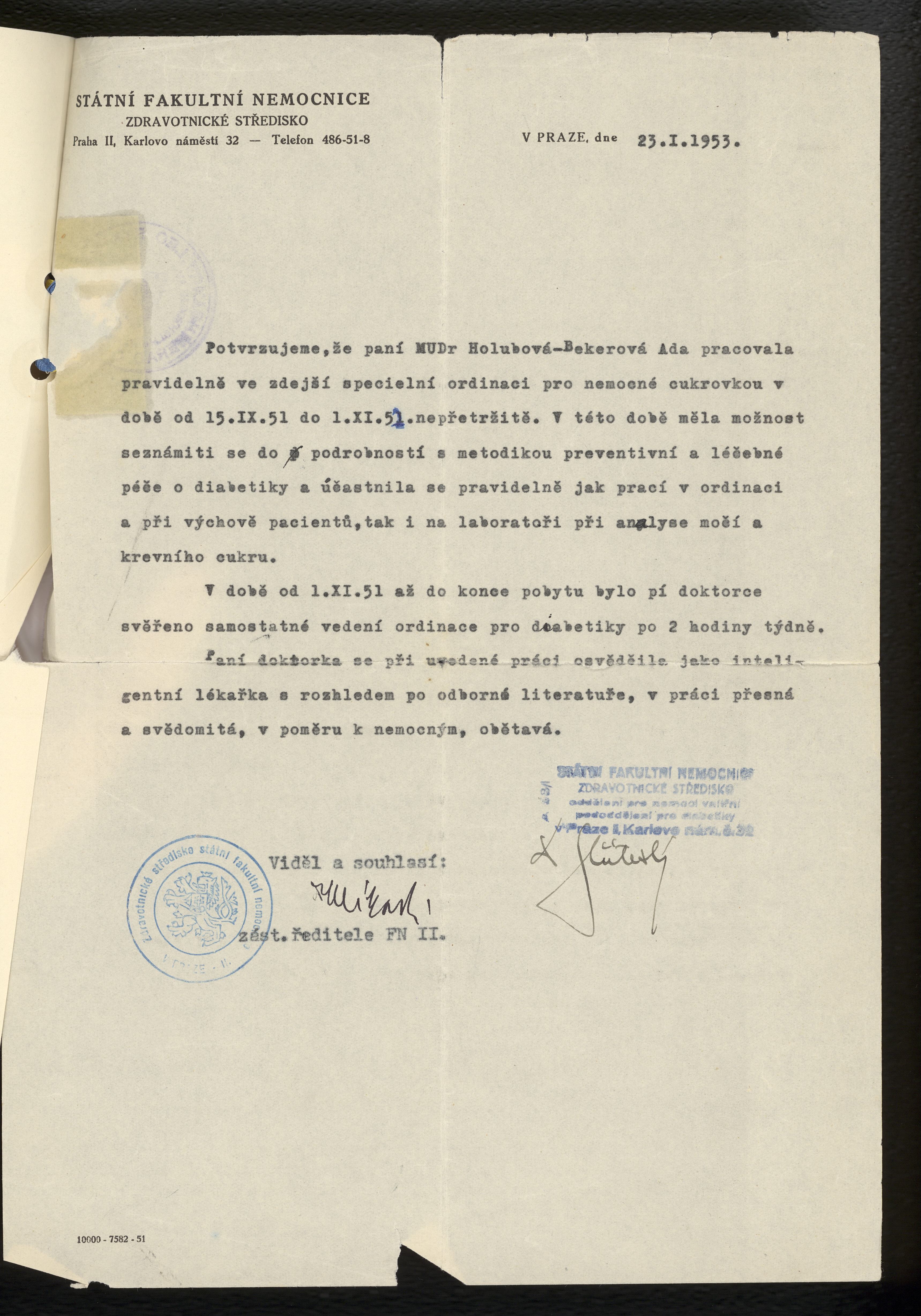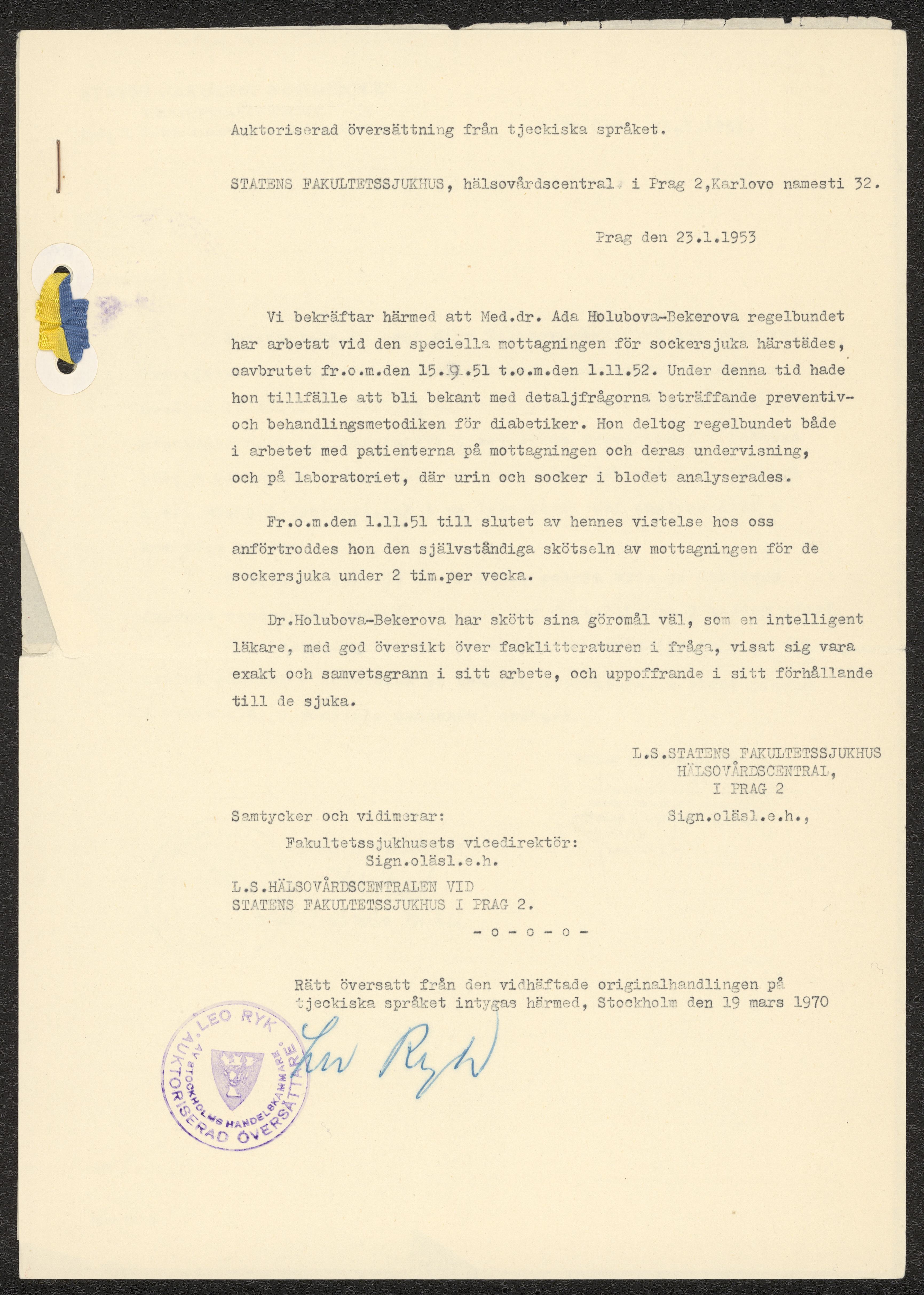 Auktoriserad översättning till sveska av arbetsintyg för Ada Becker daterat 1953. Intyg om väl utfört arbete vid specialistdiabetesmottagningen vid Statens fakultetssjukhus. Dokumentet är fäst vid originaldokumentet på tjeckiska.