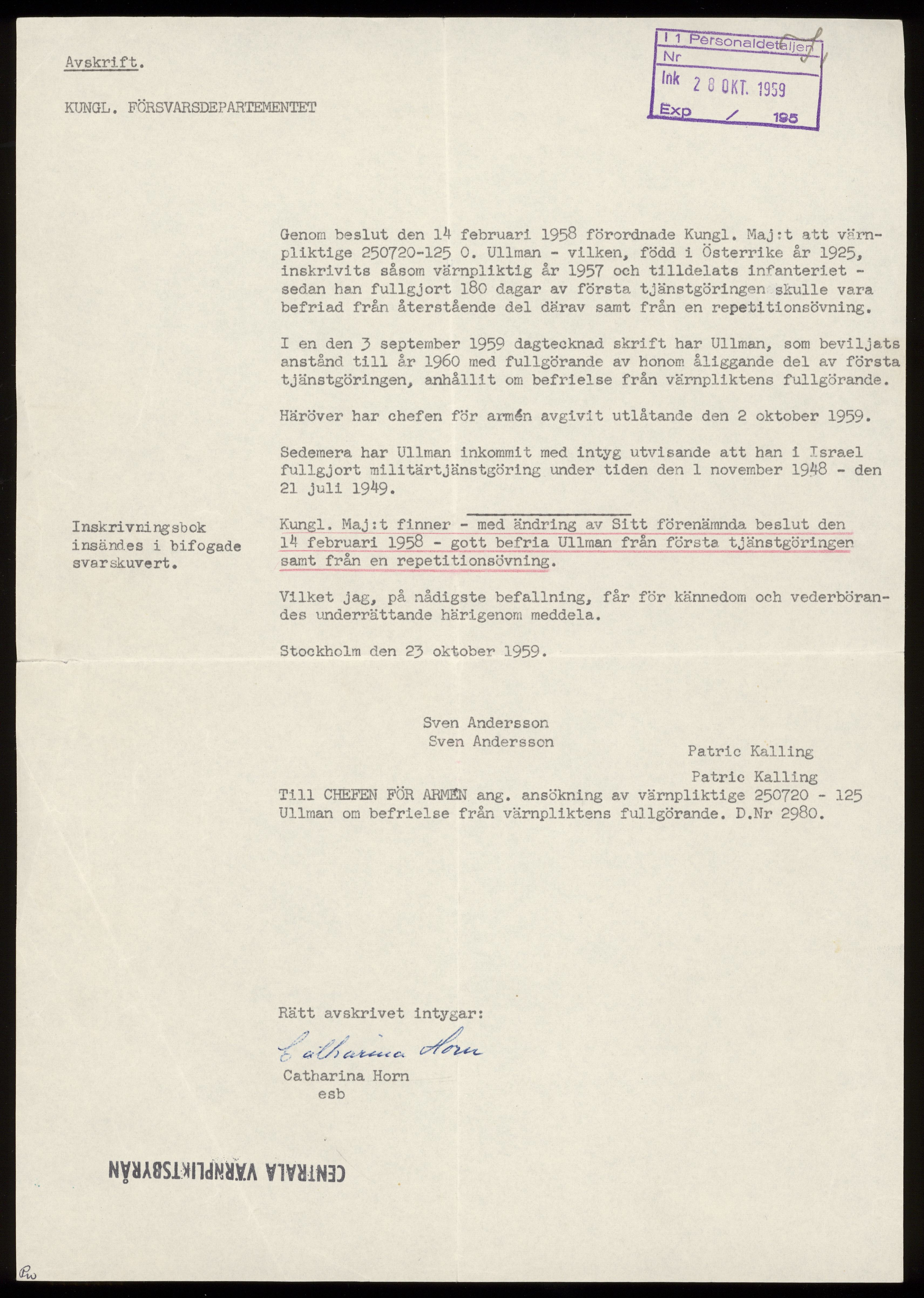 Officiellt brev från Catharina Horn på Kungliga Försvarsdepartementet 23 oktober 1959 Stockholm.