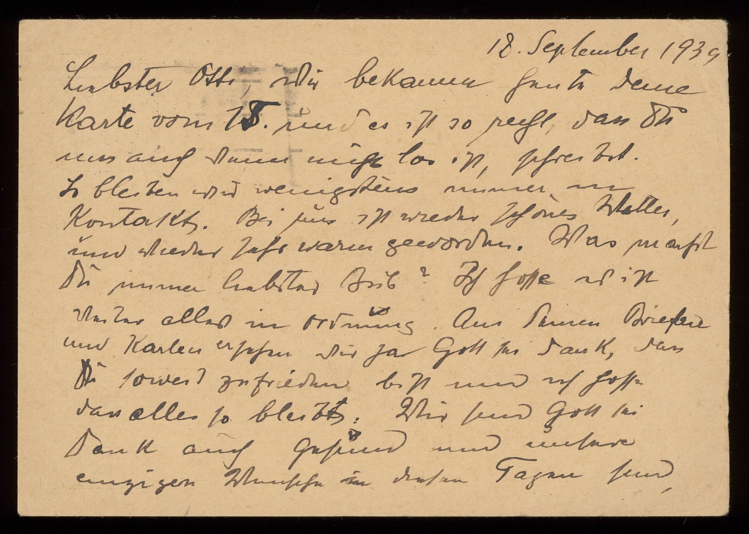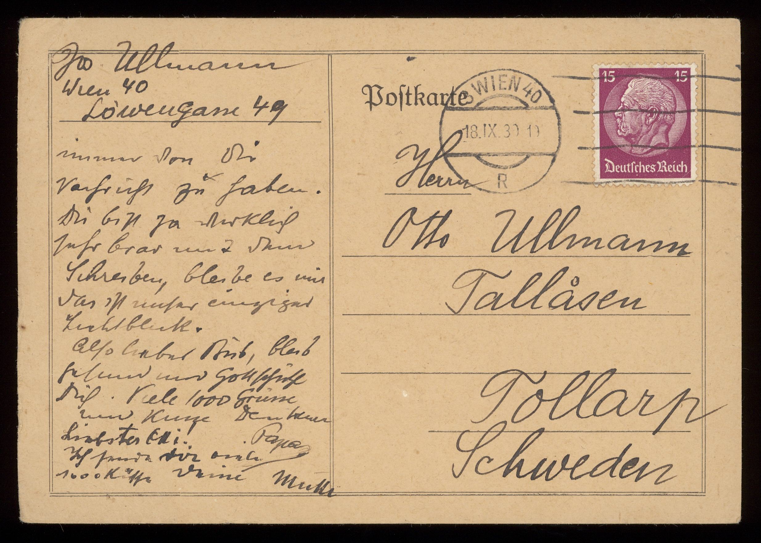 Brev till Otto Ullman från föräldrarna Josef och Elise Ullmann daterat 18 september 1939 Wien.