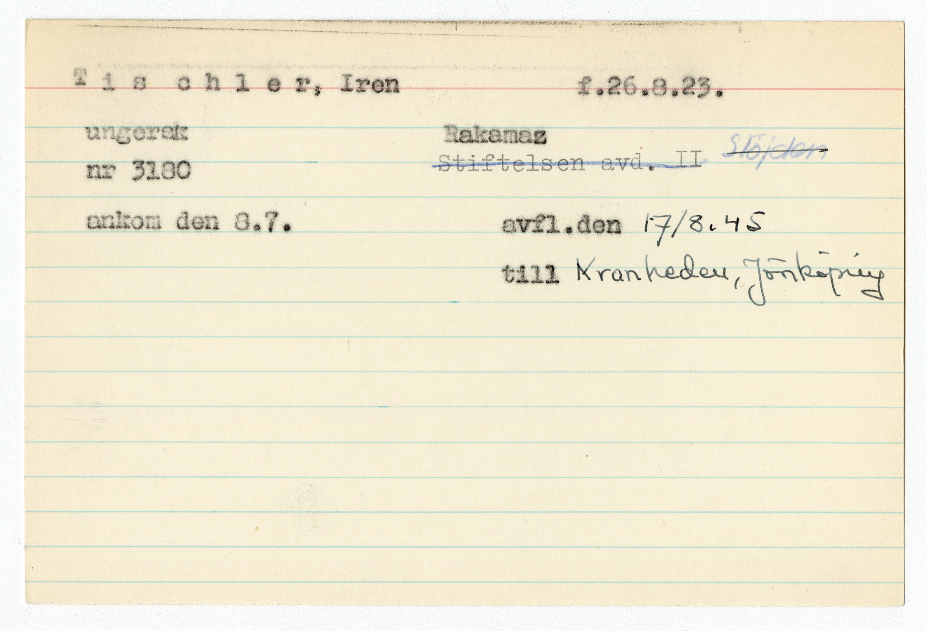 Ett skrivkort med patientuppgifter gällande Iren Tischler.